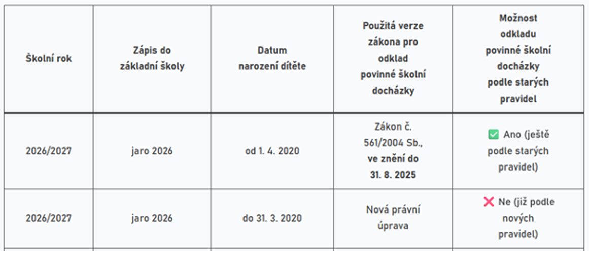 - Pro děti narozené od 1. dubna 2020 platí přechodná ustanovení: mohou požádat o odklad podle dřívějších pravidel.