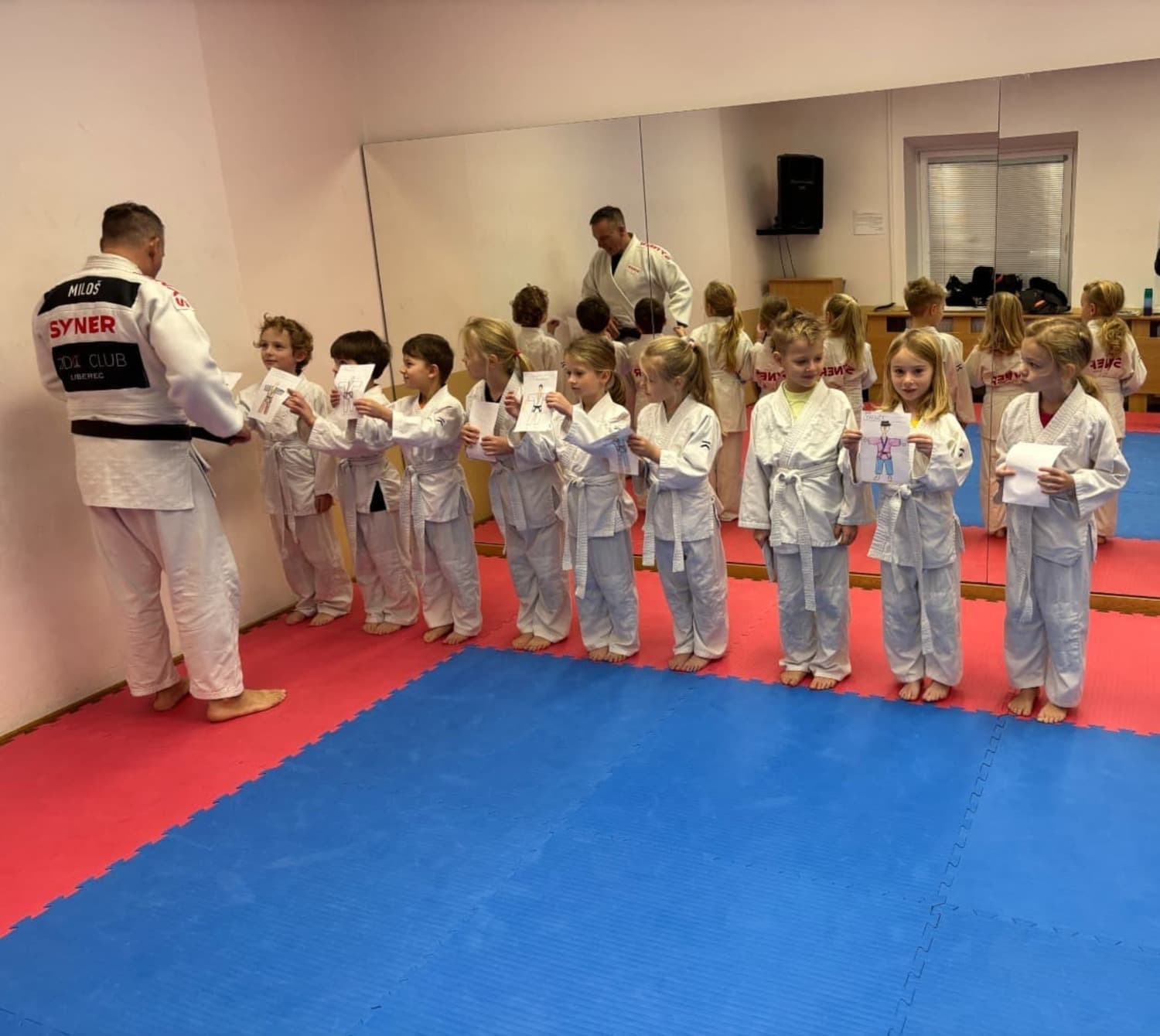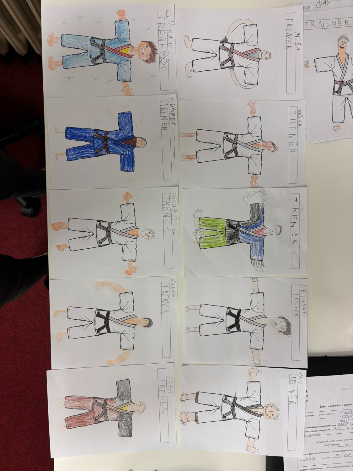 Máme za sebou další úspěšné lekce juda, během kterých jsme se všichni naučili kotoul vpřed i pád vzad. Kromě pohybu si osvojujeme také nová slovíčka. Při učení písmene T jsme si vzpomněli na našeho pana trenéra, s radostí jsme mu tak nakreslili portrét i s kimonem.
