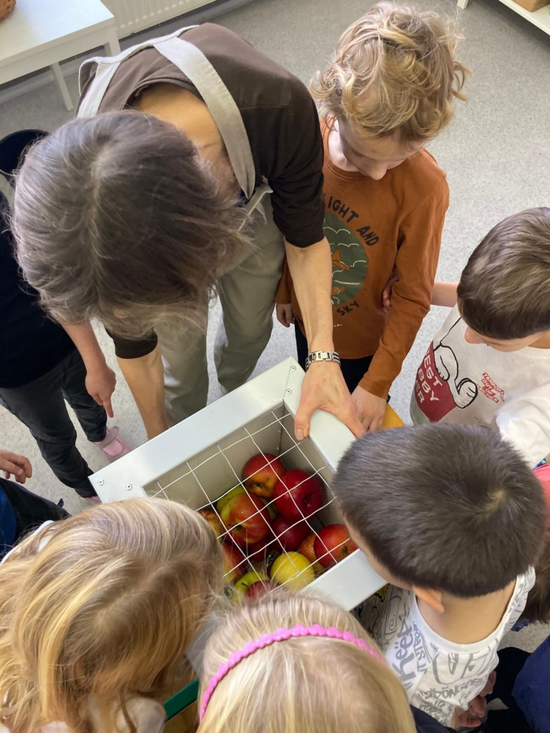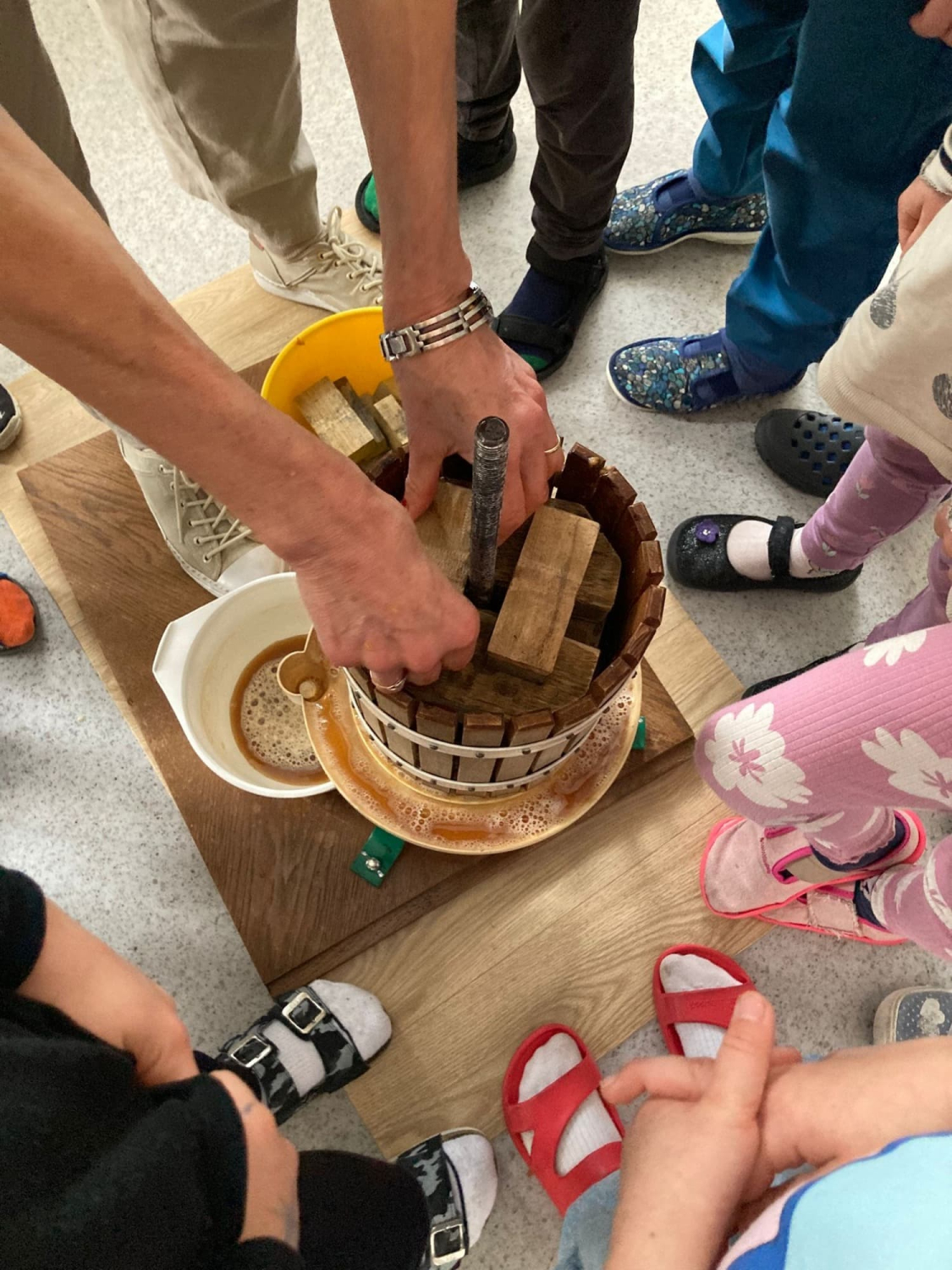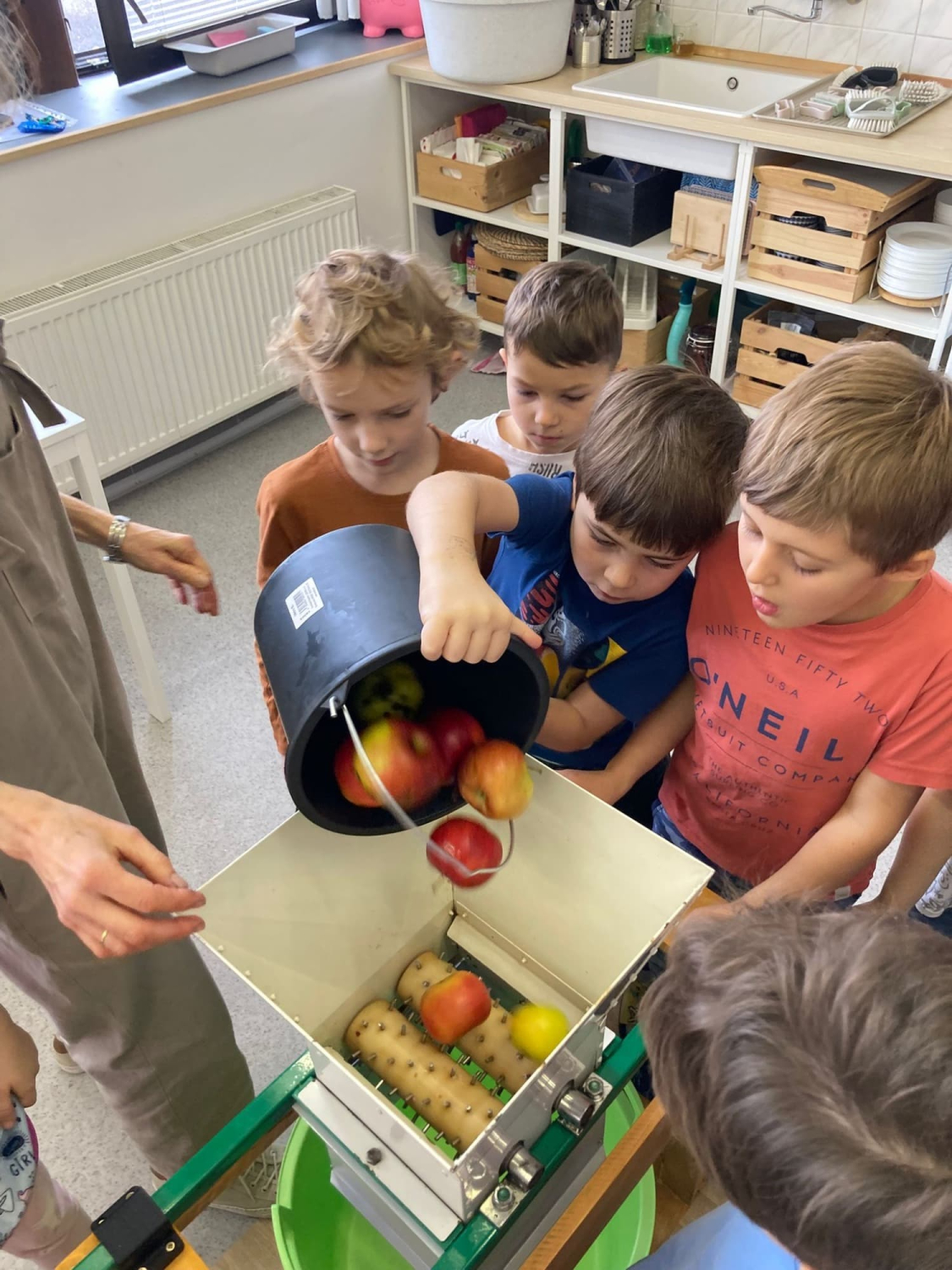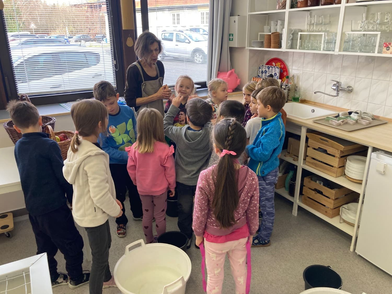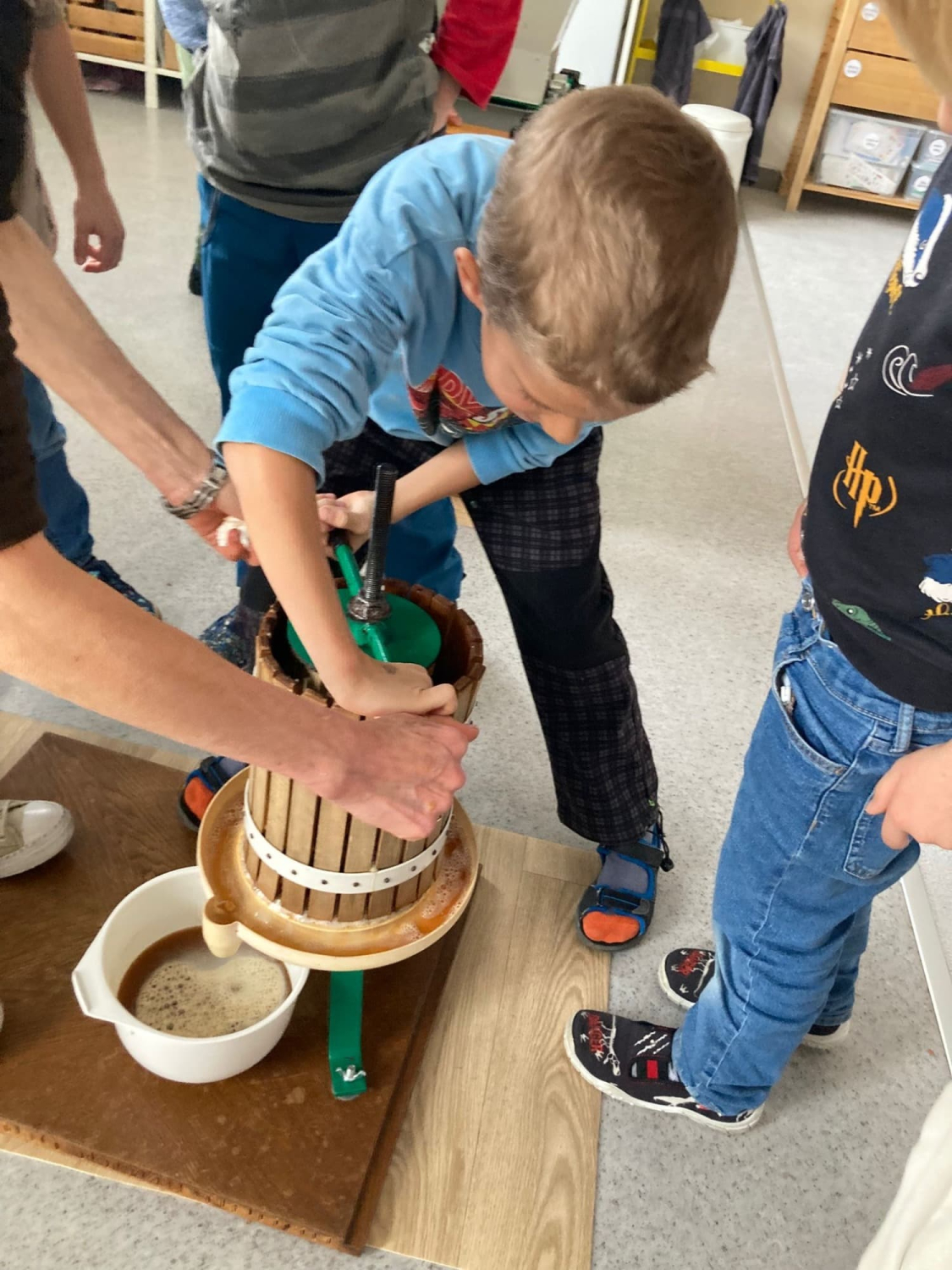 První návštěva v Motyčkovic klice byla úspěšná. Přivítali jsme se, seznámili jsme se s prostorem, rozhýbali jsme se a začali jsme si povídat o podzimu a ovoci. Zjistili jsme, co vše se může dobrého uvařit, upéct a vytvořit z hrušek, švestek a jablek. Poté jsme se vrhli na hlavní úkol dne - tvorbu jablečného moštu. Mošt se všem velmi povedl a na závěr nechyběla ochutnávka. Budeme se těšit na další návštěvu Motyčkovic kliky.