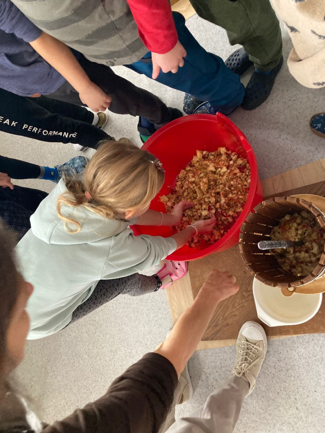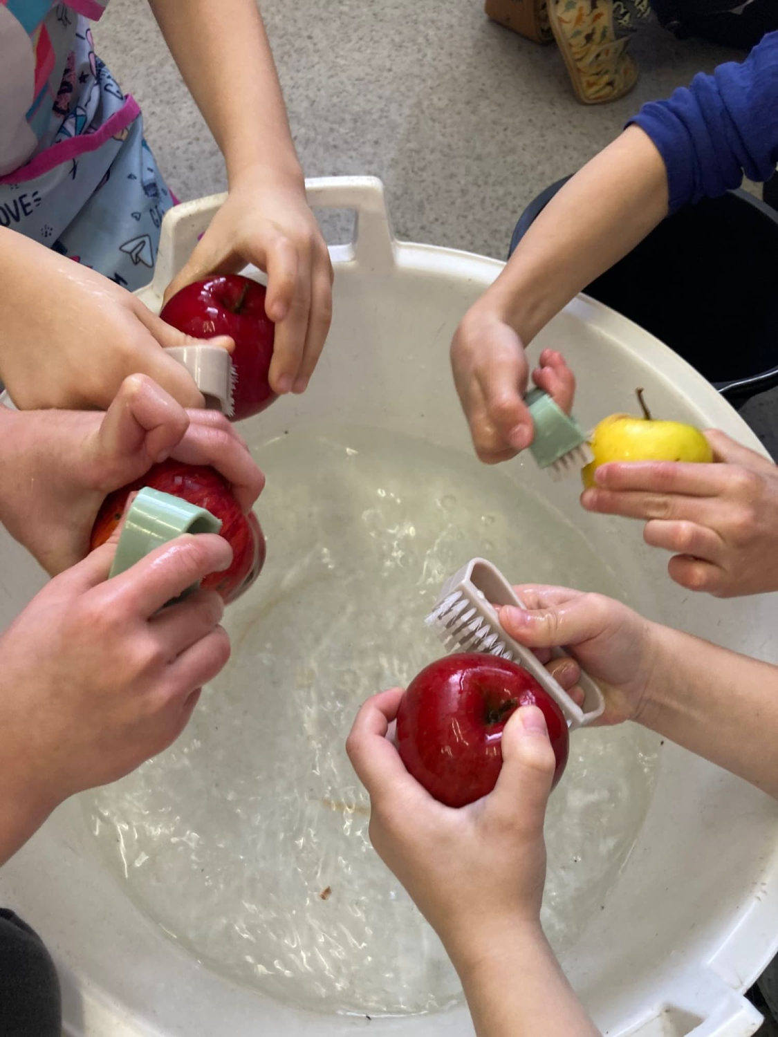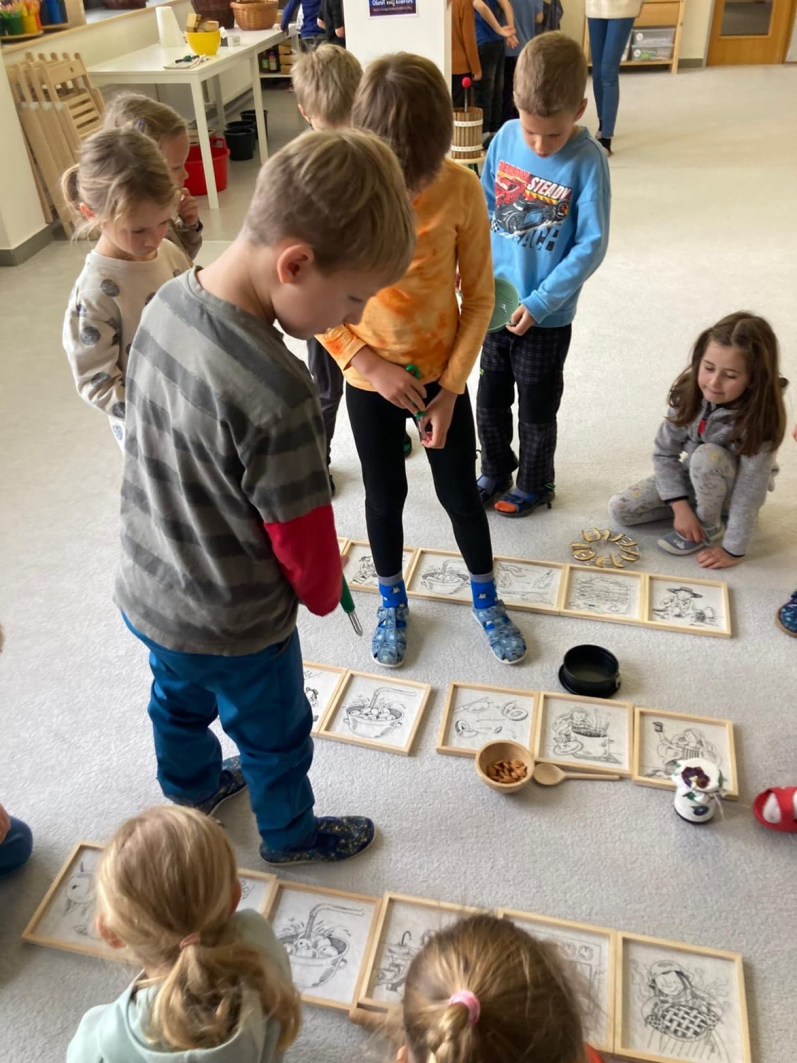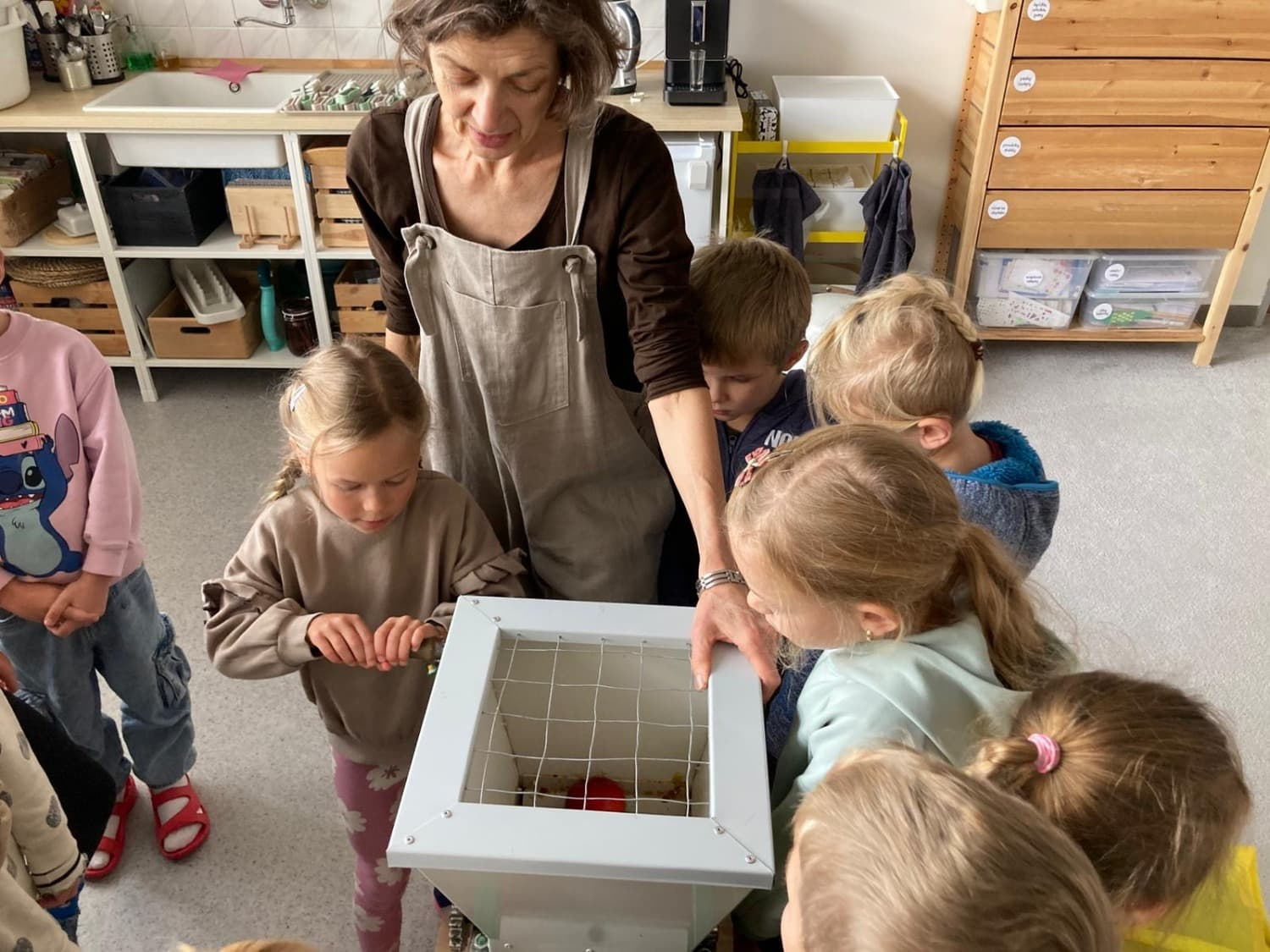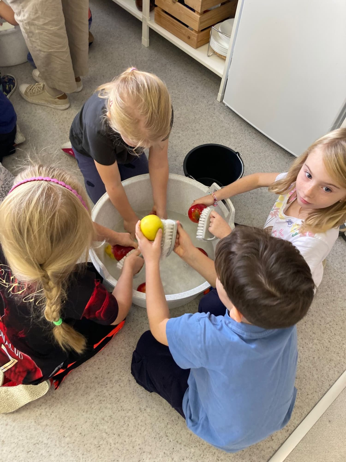 První návštěva v Motyčkovic klice byla úspěšná. Přivítali jsme se, seznámili jsme se s prostorem, rozhýbali jsme se a začali jsme si povídat o podzimu a ovoci. Zjistili jsme, co vše se může dobrého uvařit, upéct a vytvořit z hrušek, švestek a jablek. Poté jsme se vrhli na hlavní úkol dne - tvorbu jablečného moštu. Mošt se všem velmi povedl a na závěr nechyběla ochutnávka. Budeme se těšit na další návštěvu Motyčkovic kliky.
