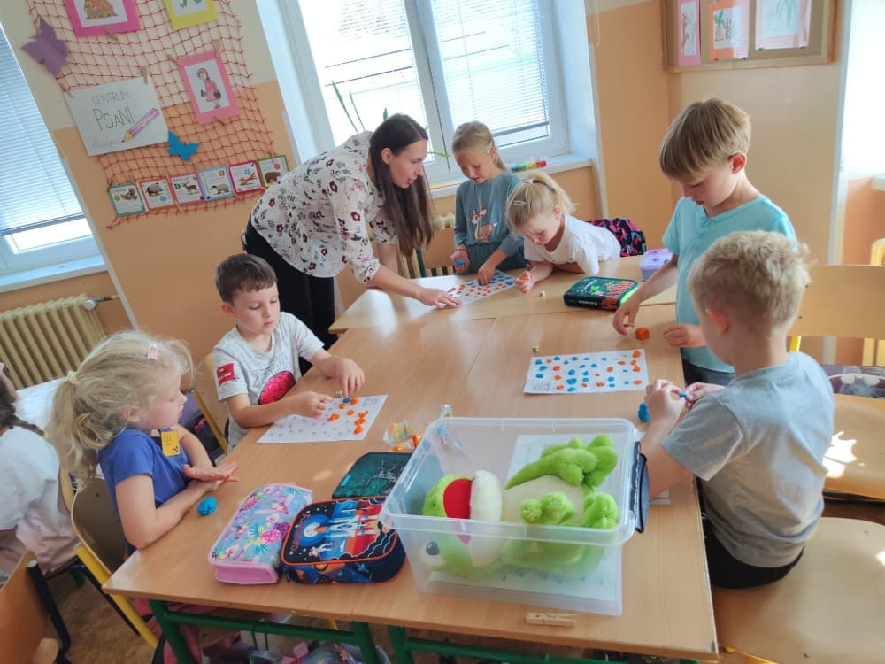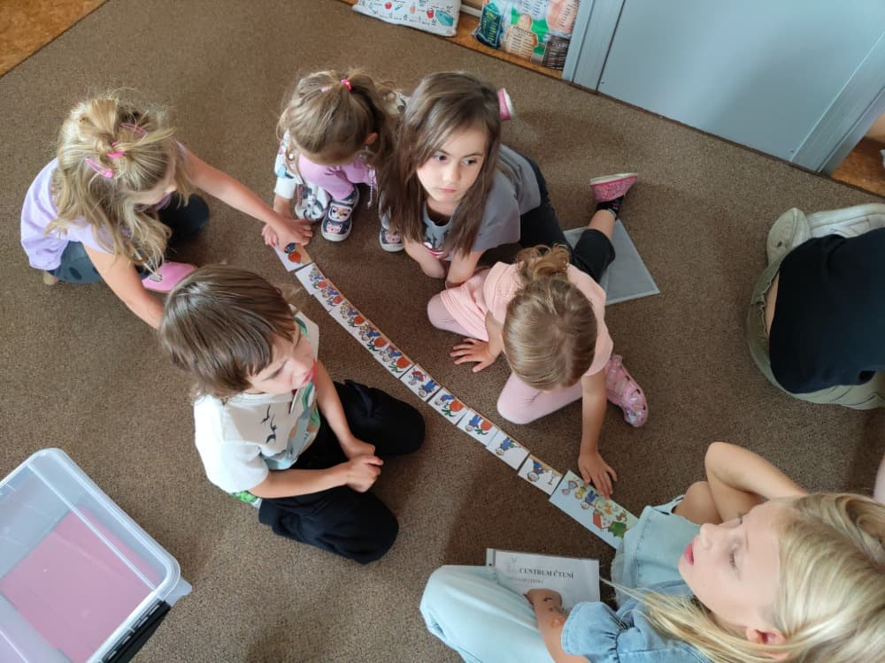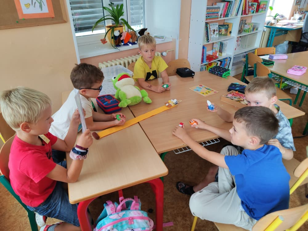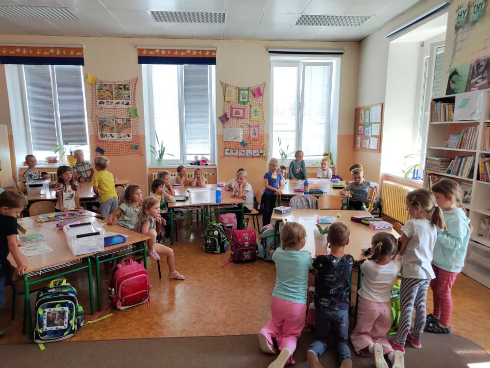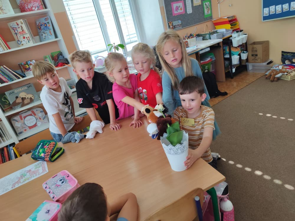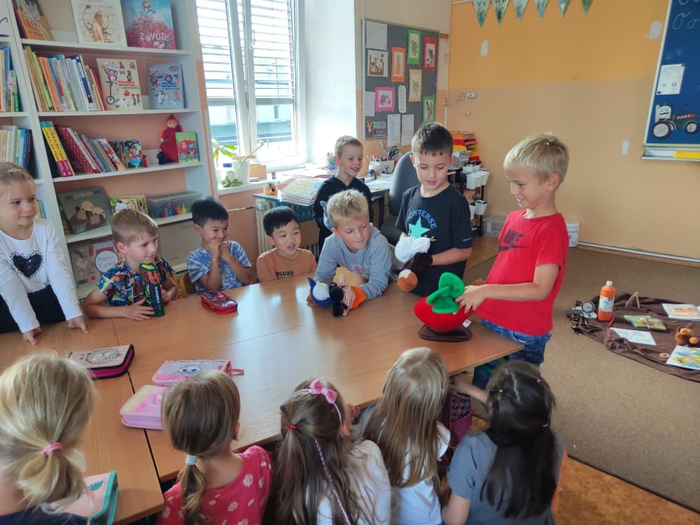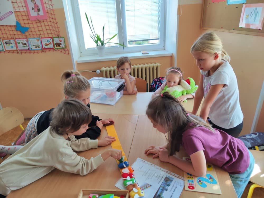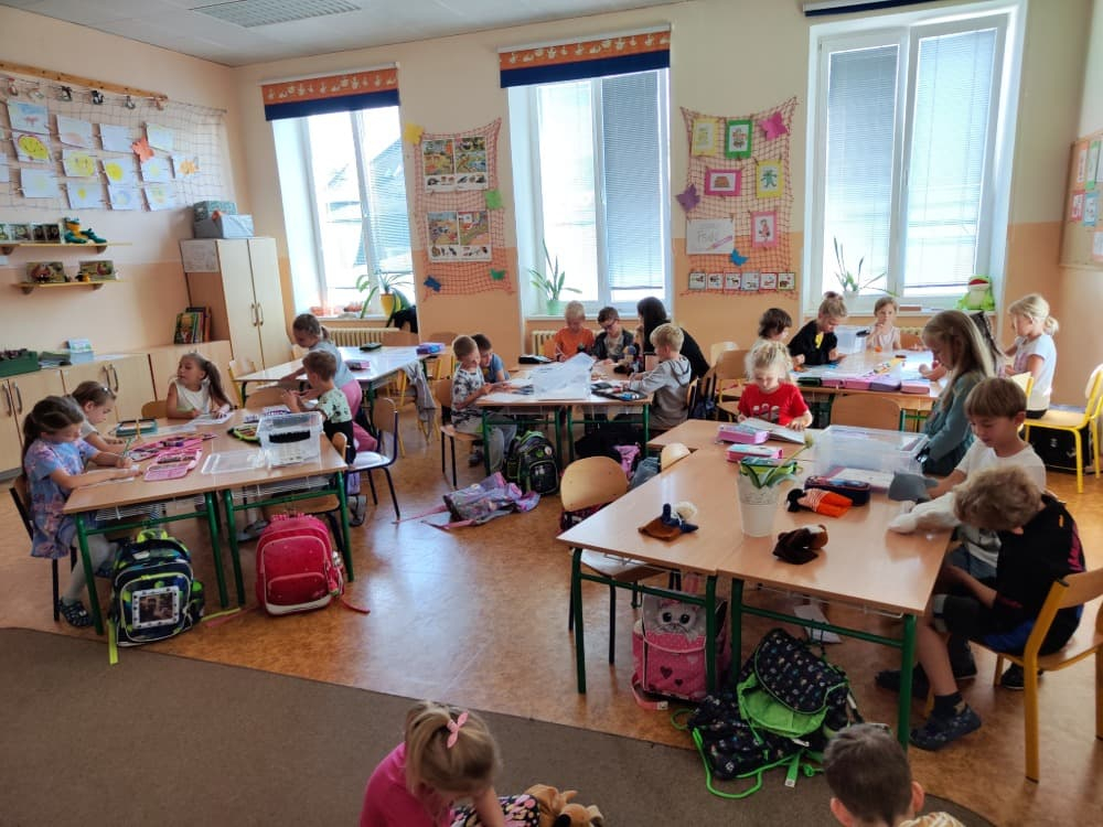 Hned druhý školní týden jsme se odvážně vrhli na práci v centrech aktivit. Práce nám šla hezky od ruky. Prvňáčci pilně pracovali a báječně spolupracovali. Někteří už ostatním i četli zadání. Čekalo je pečlivé vybarvování srnečky v ateliéru, lepení much na mucholapku u žabky Márinky v matematice a "chytání" much pro ni ke svačině. Poznávání a psaní písmenek J jako Jeníček a M jako Mařenka z perníkové chaloupky v centru psaní, poslouchání pohádky o veliké řepě, řazení obrázků a poté její dramatizace v centru čtení a poznávání lesních zvířecích rodin v centru vědy a objevů. Prvňáčci skvěle zvládli i své první hodnotící kruhy a své práce v nich krásně odprezentovali.