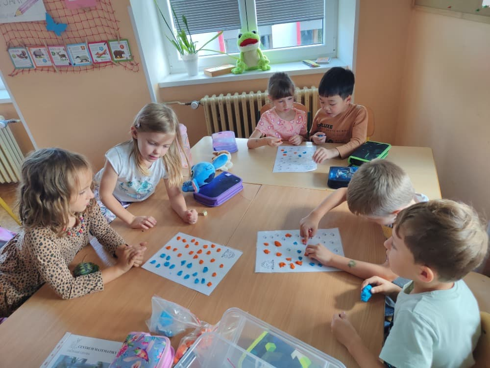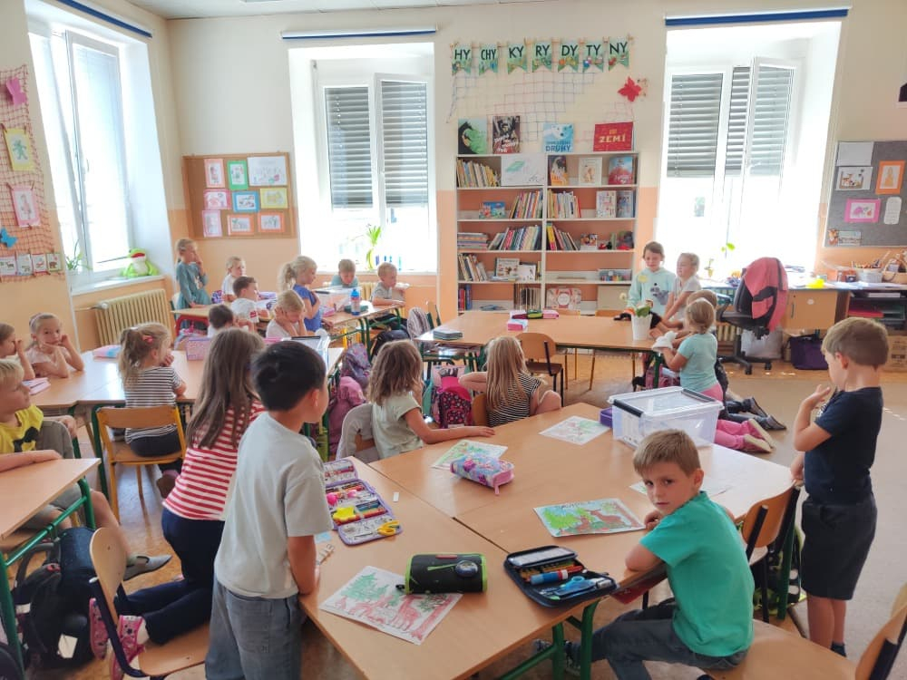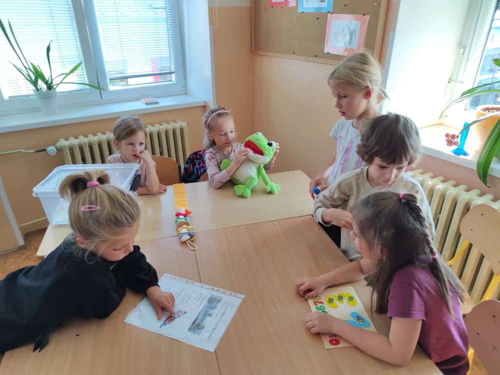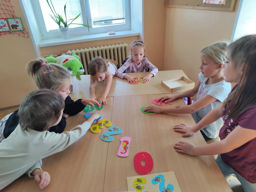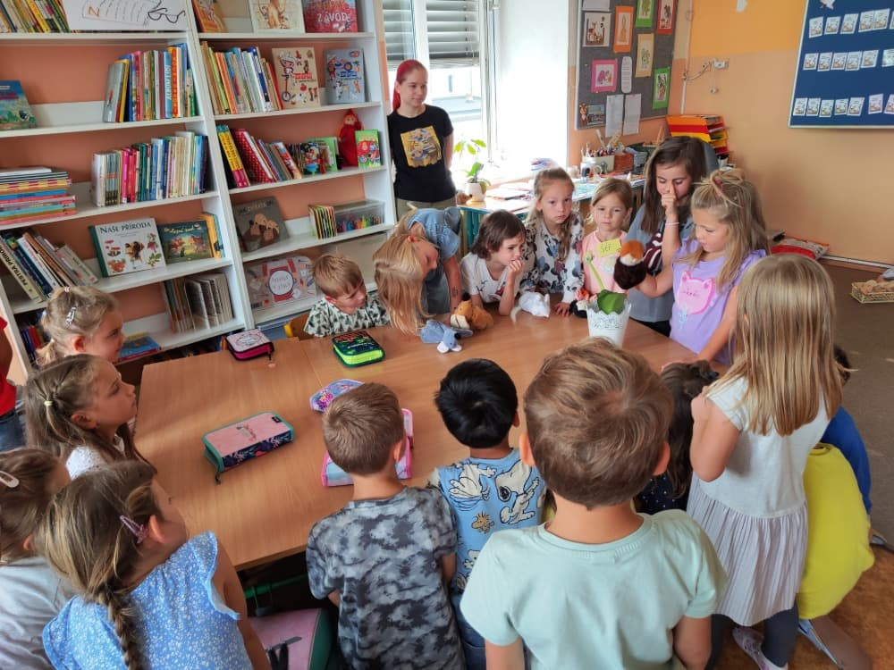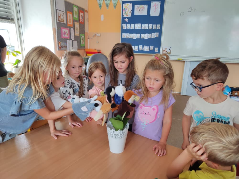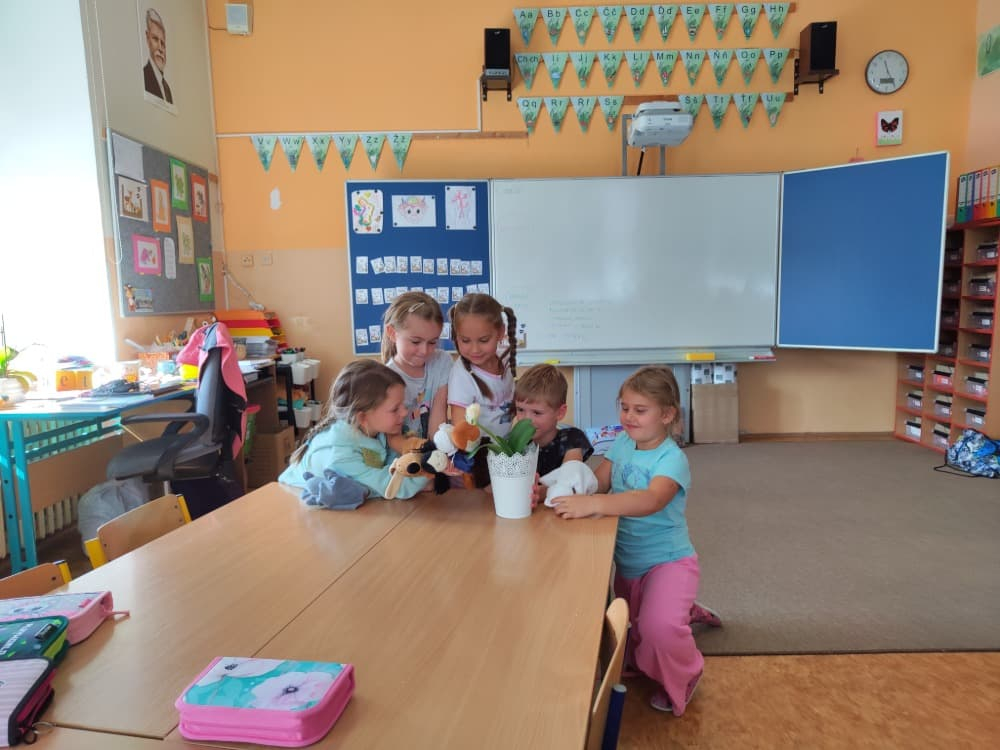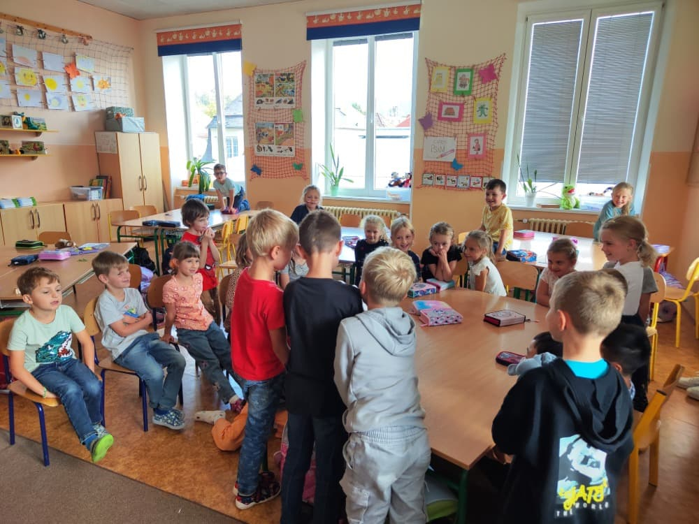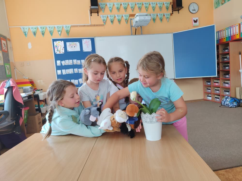 Hned druhý školní týden jsme se odvážně vrhli na práci v centrech aktivit. Práce nám šla hezky od ruky. Prvňáčci pilně pracovali a báječně spolupracovali. Někteří už ostatním i četli zadání. Čekalo je pečlivé vybarvování srnečky v ateliéru, lepení much na mucholapku u žabky Márinky v matematice a "chytání" much pro ni ke svačině. Poznávání a psaní písmenek J jako Jeníček a M jako Mařenka z perníkové chaloupky v centru psaní, poslouchání pohádky o veliké řepě, řazení obrázků a poté její dramatizace v centru čtení a poznávání lesních zvířecích rodin v centru vědy a objevů. Prvňáčci skvěle zvládli i své první hodnotící kruhy a své práce v nich krásně odprezentovali.