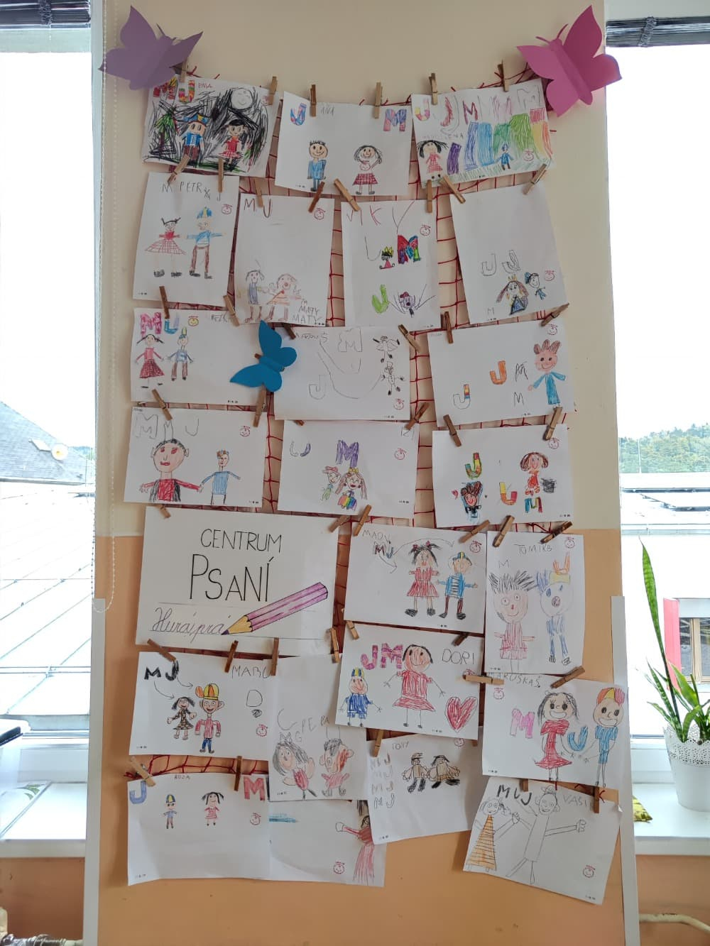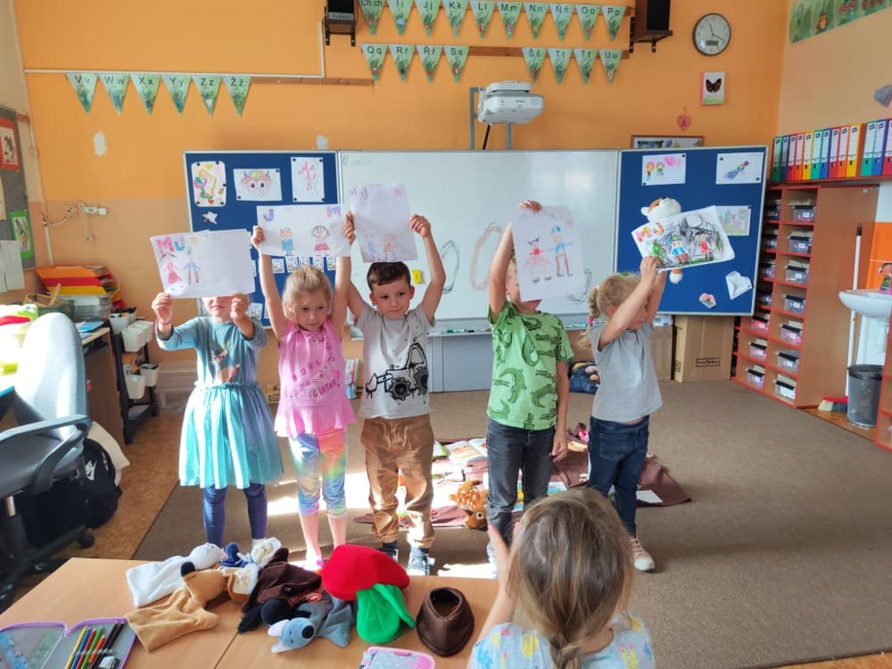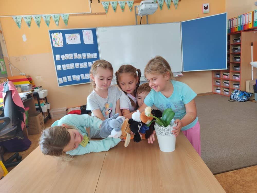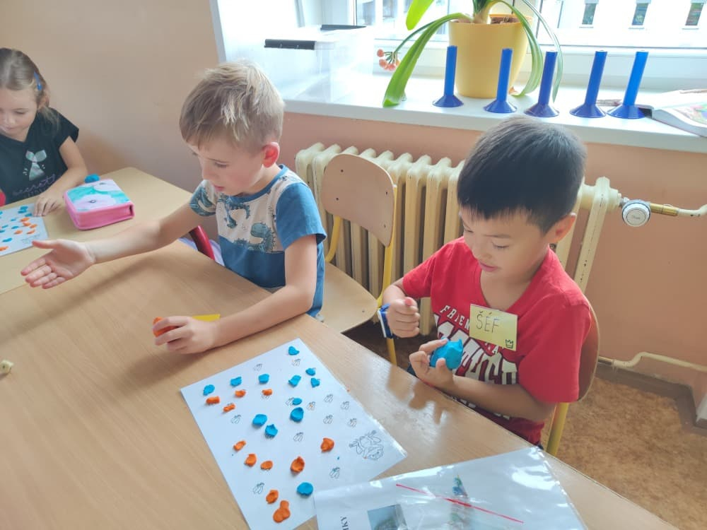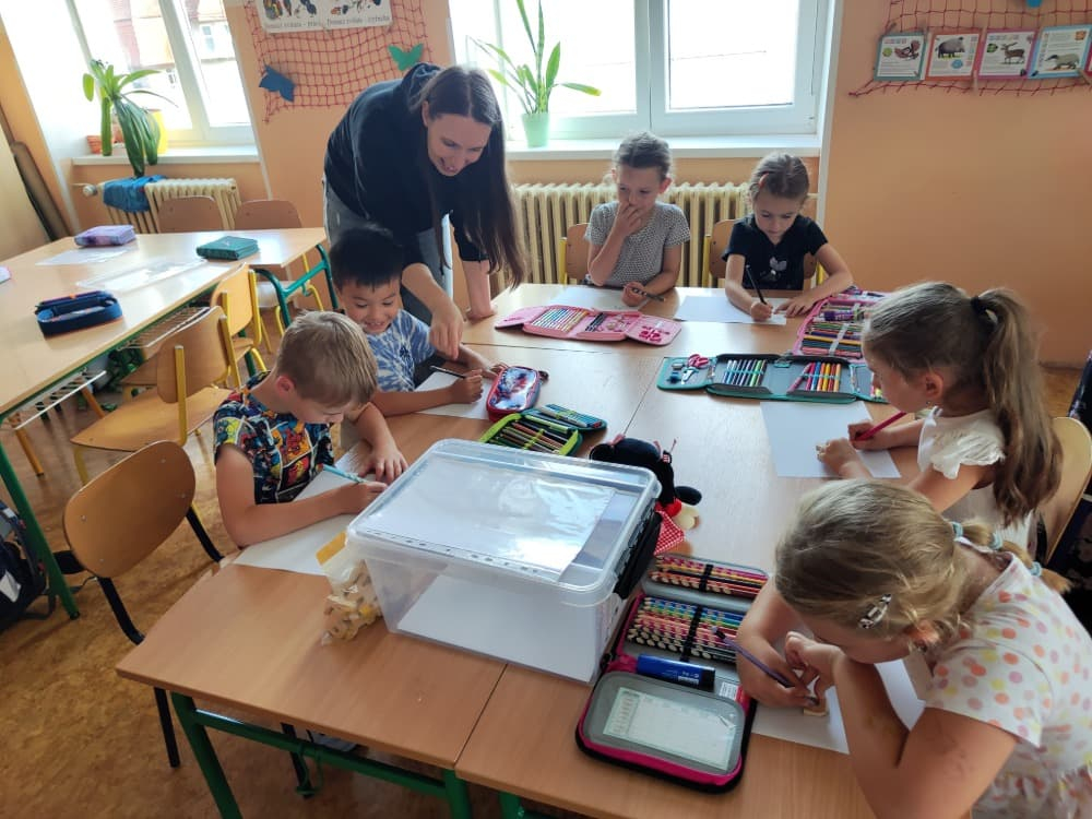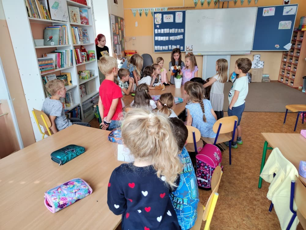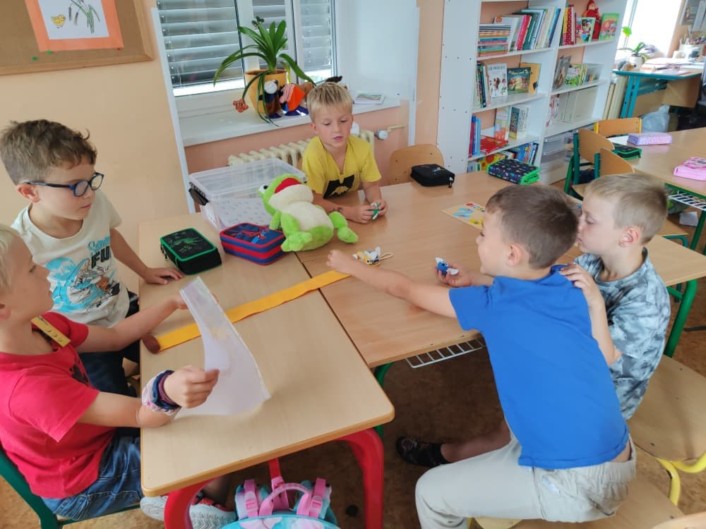 Hned druhý školní týden jsme se odvážně vrhli na práci v centrech aktivit. Práce nám šla hezky od ruky. Prvňáčci pilně pracovali a báječně spolupracovali. Někteří už ostatním i četli zadání. Čekalo je pečlivé vybarvování srnečky v ateliéru, lepení much na mucholapku u žabky Márinky v matematice a "chytání" much pro ni ke svačině. Poznávání a psaní písmenek J jako Jeníček a M jako Mařenka z perníkové chaloupky v centru psaní, poslouchání pohádky o veliké řepě, řazení obrázků a poté její dramatizace v centru čtení a poznávání lesních zvířecích rodin v centru vědy a objevů. Prvňáčci skvěle zvládli i své první hodnotící kruhy a své práce v nich krásně odprezentovali.