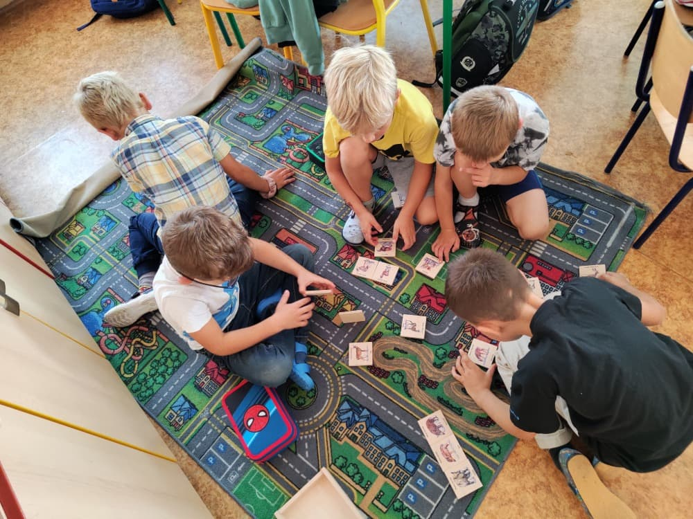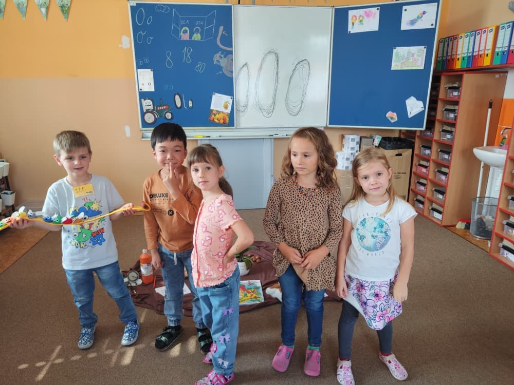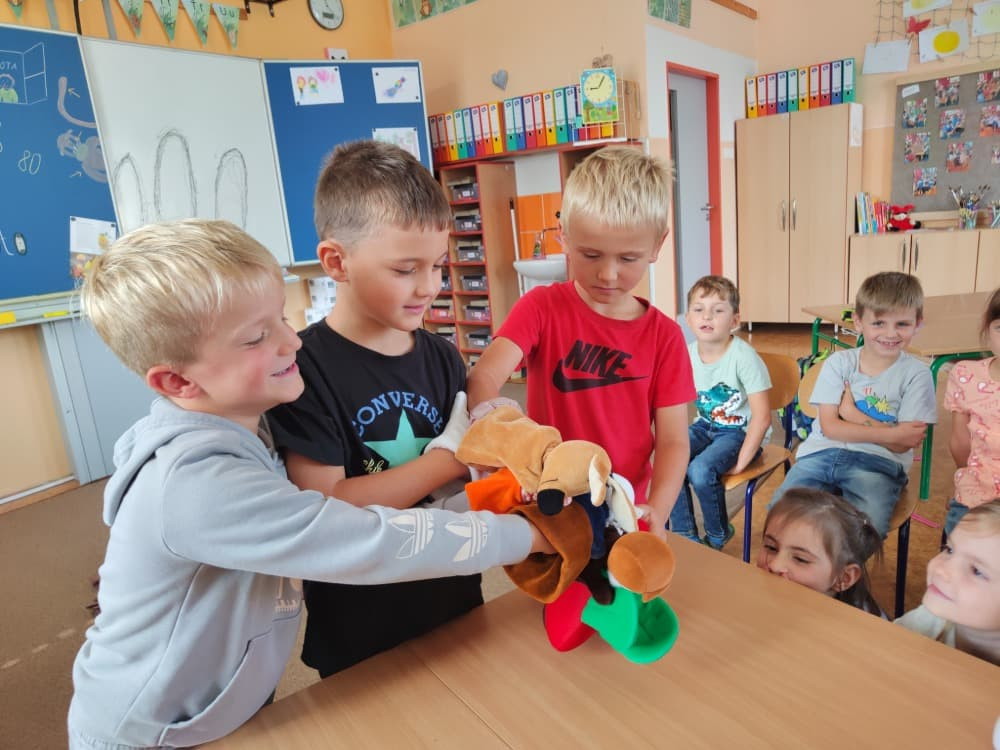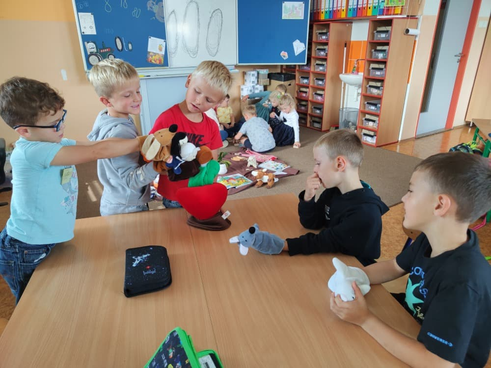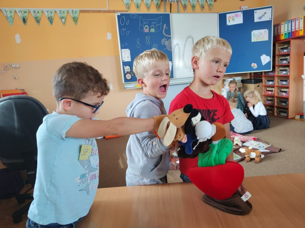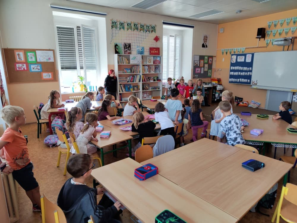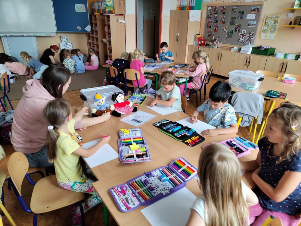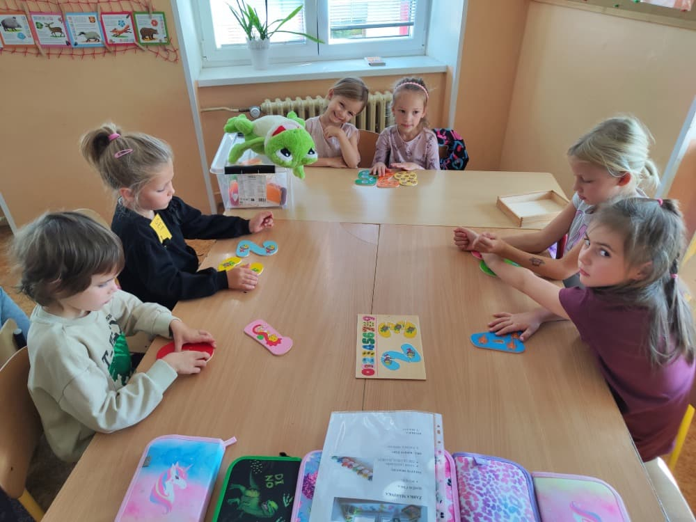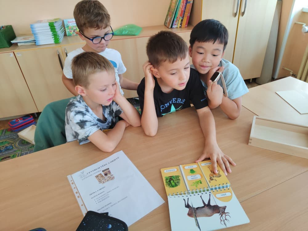 Hned druhý školní týden jsme se odvážně vrhli na práci v centrech aktivit. Práce nám šla hezky od ruky. Prvňáčci pilně pracovali a báječně spolupracovali. Někteří už ostatním i četli zadání. Čekalo je pečlivé vybarvování srnečky v ateliéru, lepení much na mucholapku u žabky Márinky v matematice a "chytání" much pro ni ke svačině. Poznávání a psaní písmenek J jako Jeníček a M jako Mařenka z perníkové chaloupky v centru psaní, poslouchání pohádky o veliké řepě, řazení obrázků a poté její dramatizace v centru čtení a poznávání lesních zvířecích rodin v centru vědy a objevů. Prvňáčci skvěle zvládli i své první hodnotící kruhy a své práce v nich krásně odprezentovali.