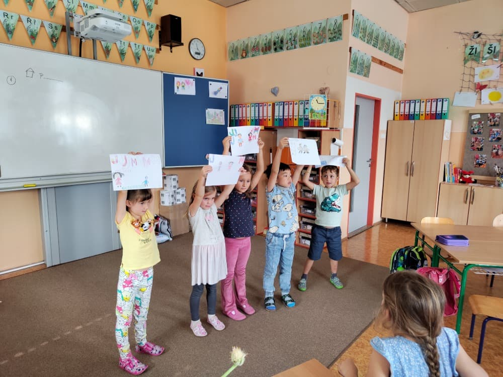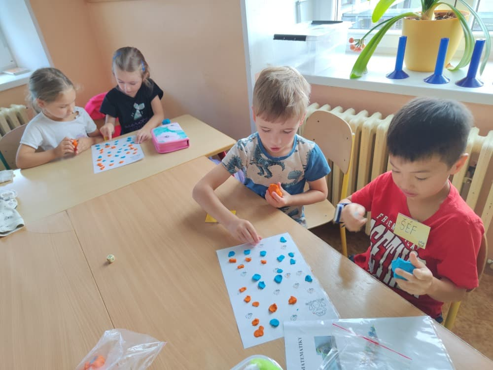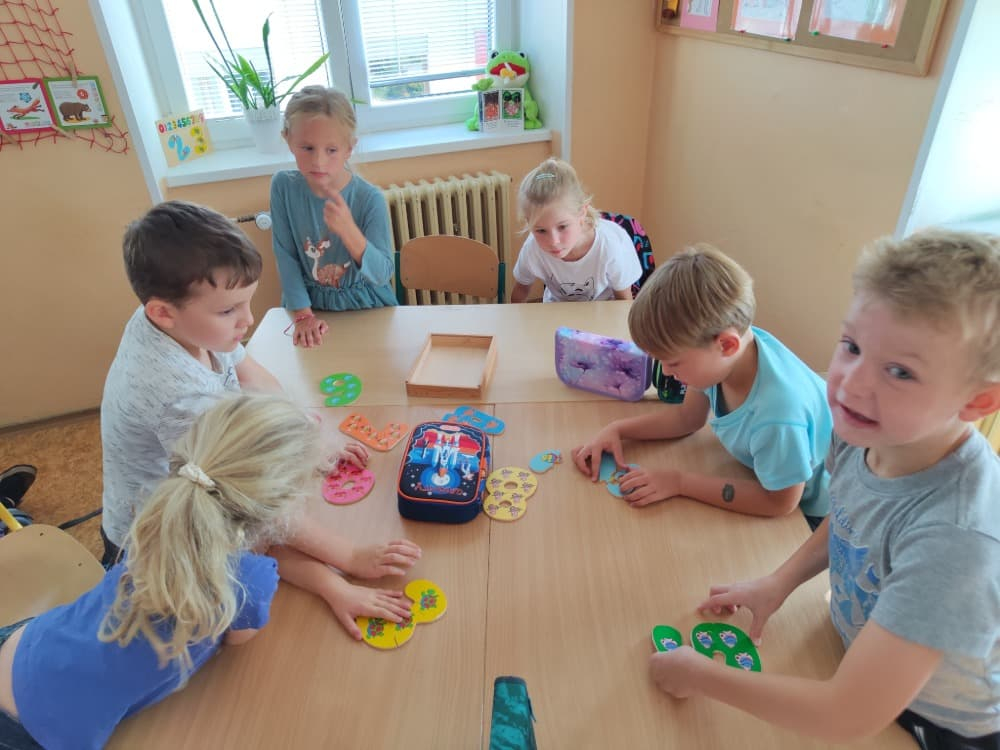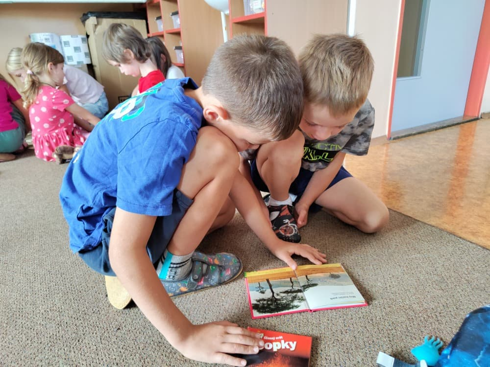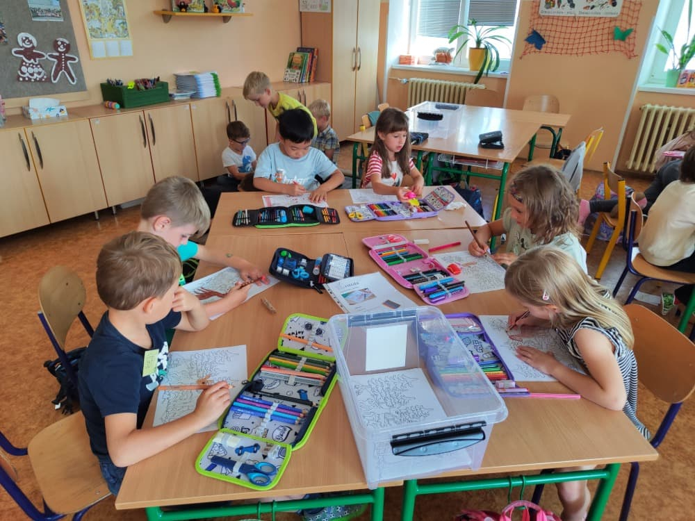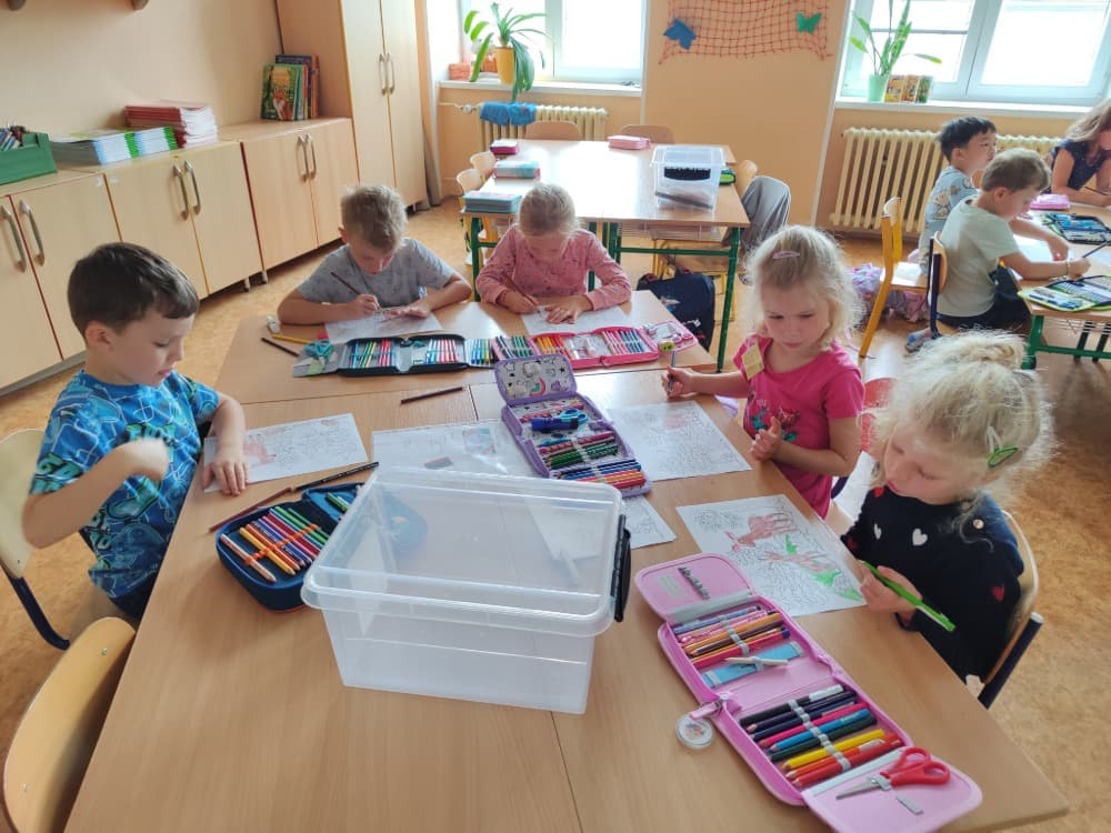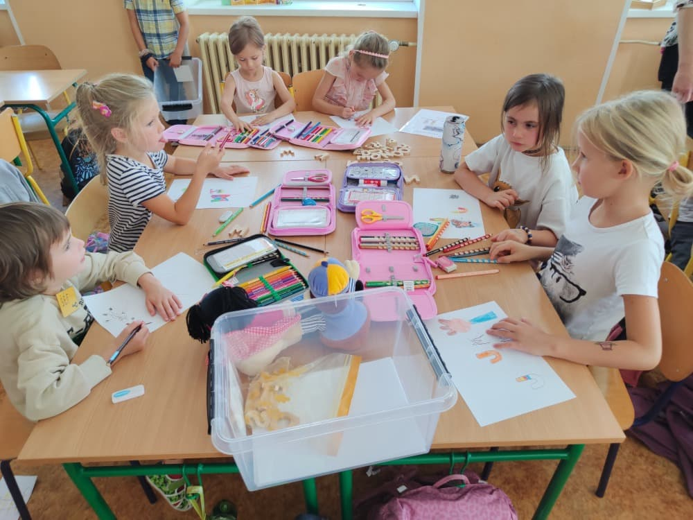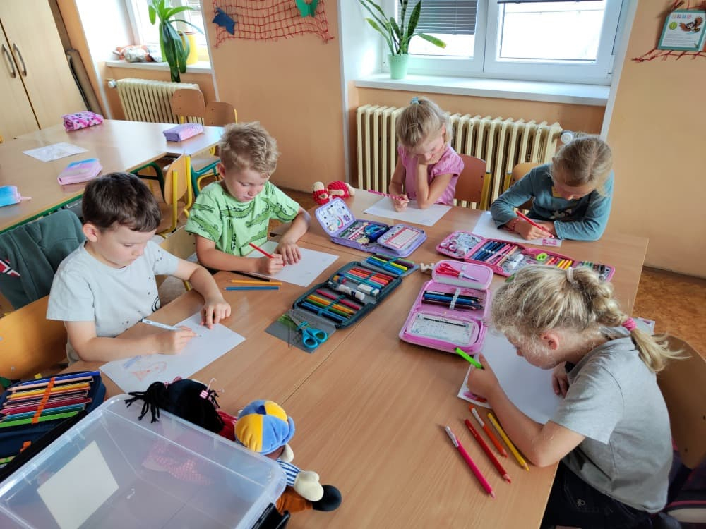 Hned druhý školní týden jsme se odvážně vrhli na práci v centrech aktivit. Práce nám šla hezky od ruky. Prvňáčci pilně pracovali a báječně spolupracovali. Někteří už ostatním i četli zadání. Čekalo je pečlivé vybarvování srnečky v ateliéru, lepení much na mucholapku u žabky Márinky v matematice a "chytání" much pro ni ke svačině. Poznávání a psaní písmenek J jako Jeníček a M jako Mařenka z perníkové chaloupky v centru psaní, poslouchání pohádky o veliké řepě, řazení obrázků a poté její dramatizace v centru čtení a poznávání lesních zvířecích rodin v centru vědy a objevů. Prvňáčci skvěle zvládli i své první hodnotící kruhy a své práce v nich krásně odprezentovali.