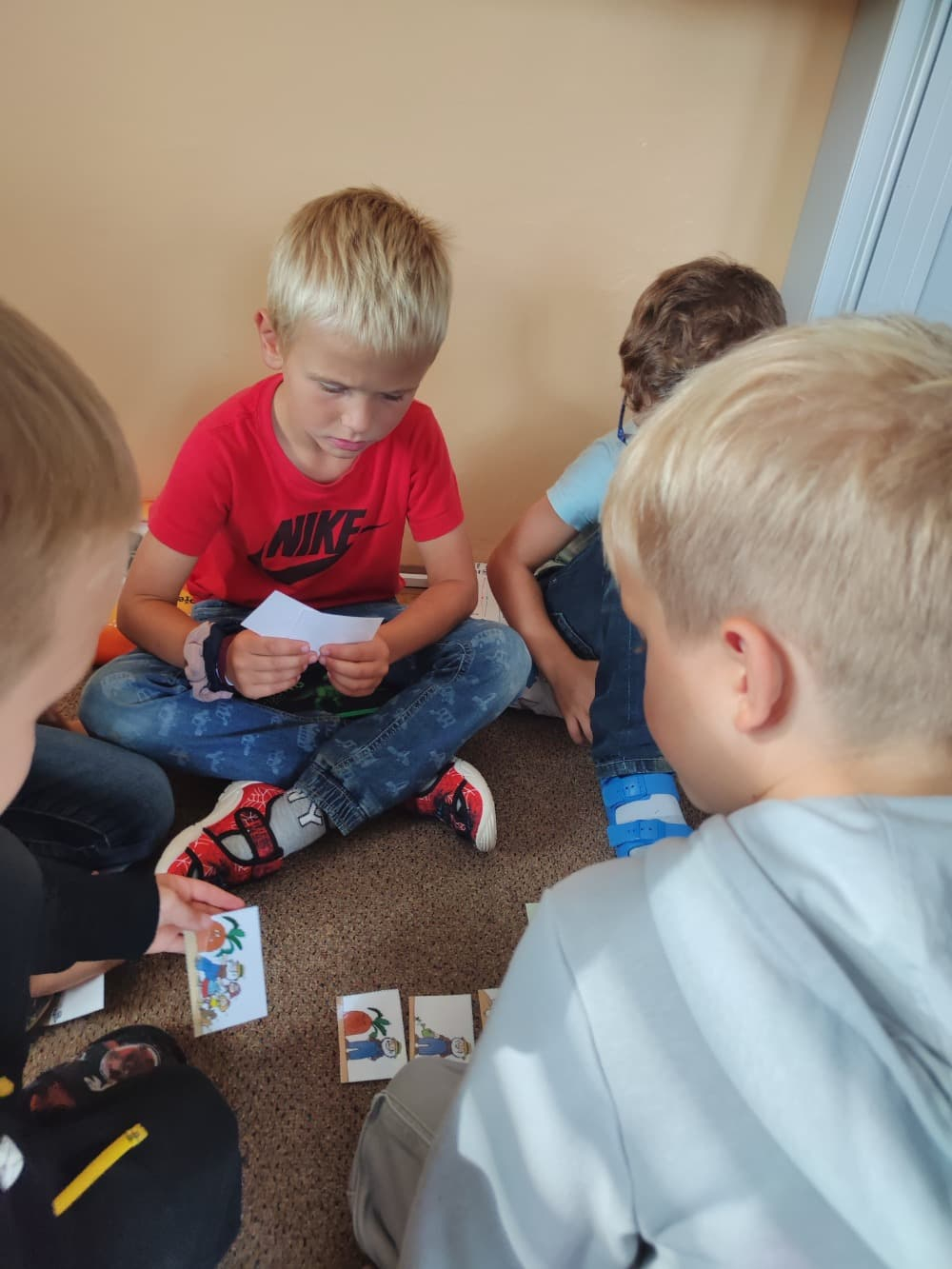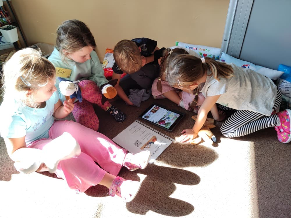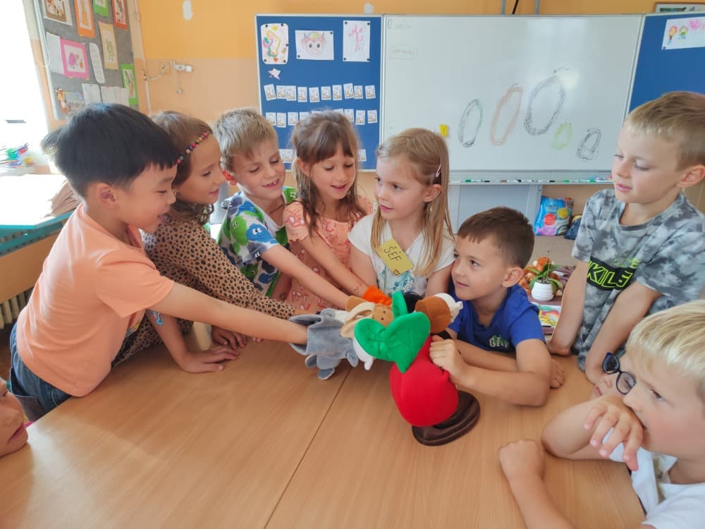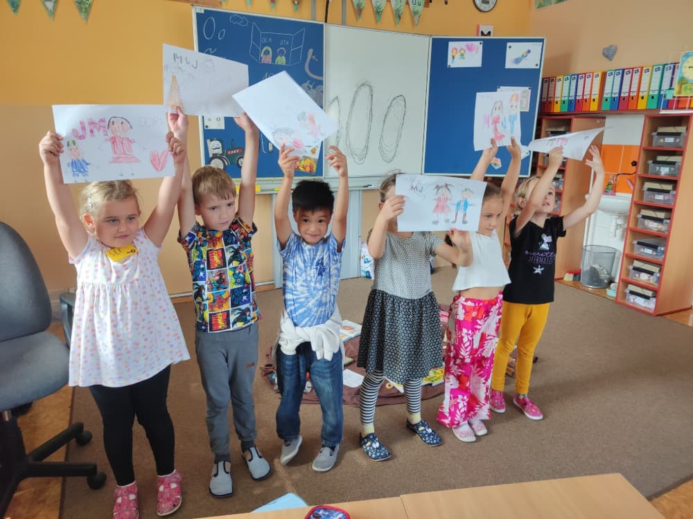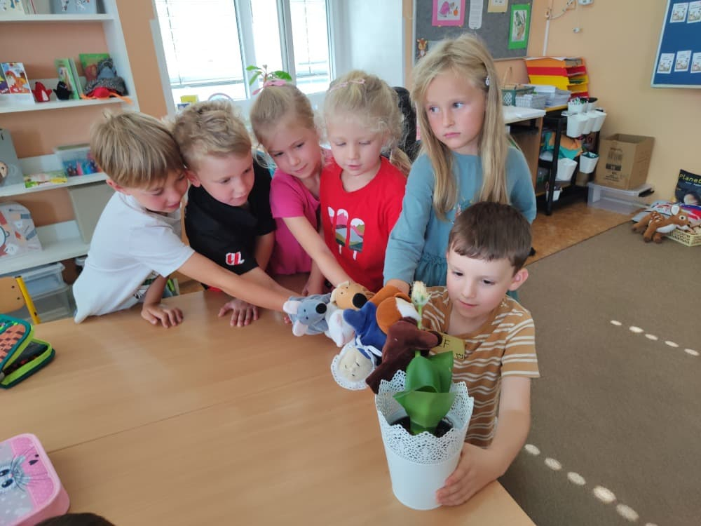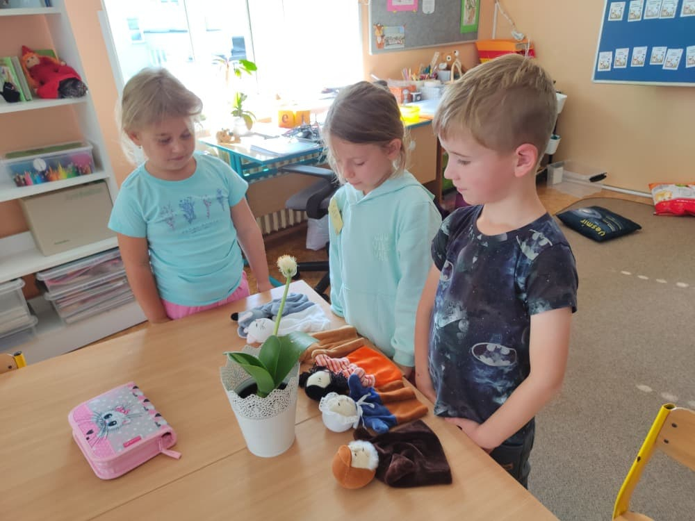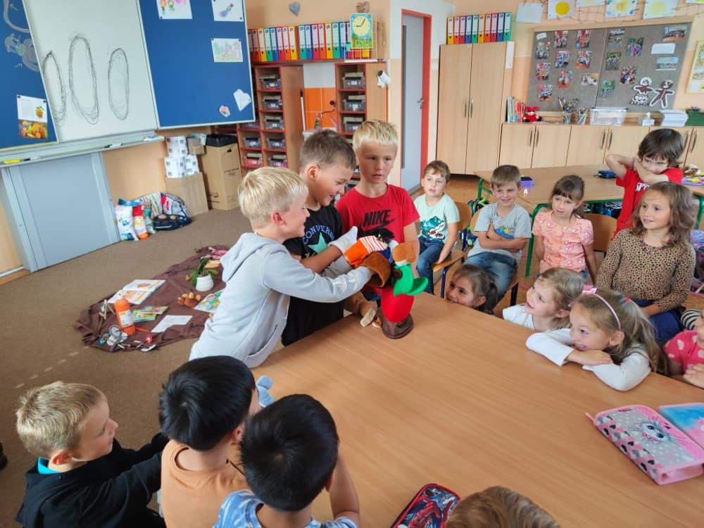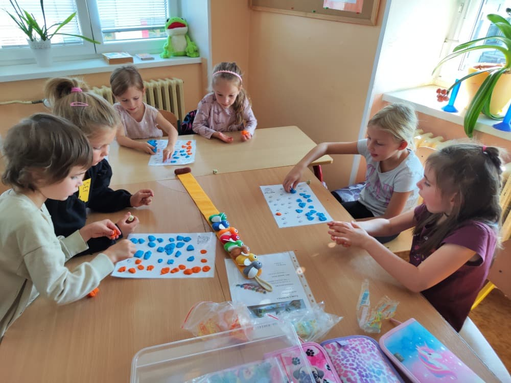 Hned druhý školní týden jsme se odvážně vrhli na práci v centrech aktivit. Práce nám šla hezky od ruky. Prvňáčci pilně pracovali a báječně spolupracovali. Někteří už ostatním i četli zadání. Čekalo je pečlivé vybarvování srnečky v ateliéru, lepení much na mucholapku u žabky Márinky v matematice a "chytání" much pro ni ke svačině. Poznávání a psaní písmenek J jako Jeníček a M jako Mařenka z perníkové chaloupky v centru psaní, poslouchání pohádky o veliké řepě, řazení obrázků a poté její dramatizace v centru čtení a poznávání lesních zvířecích rodin v centru vědy a objevů. Prvňáčci skvěle zvládli i své první hodnotící kruhy a své práce v nich krásně odprezentovali.