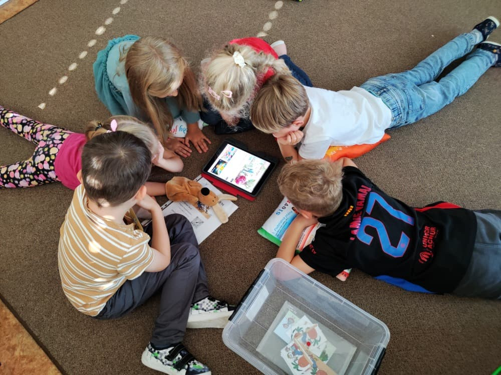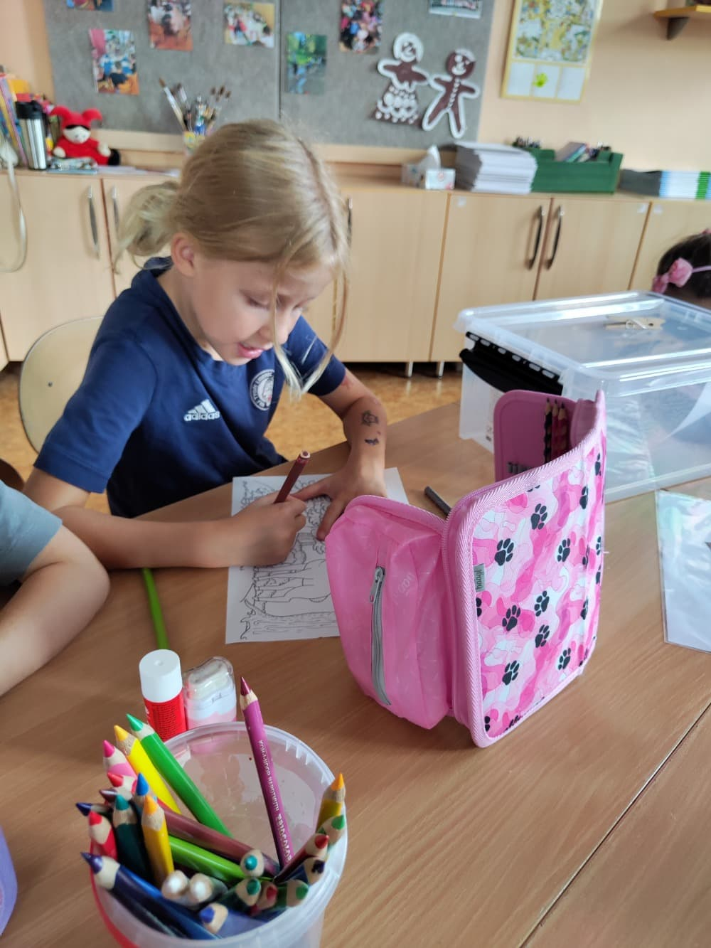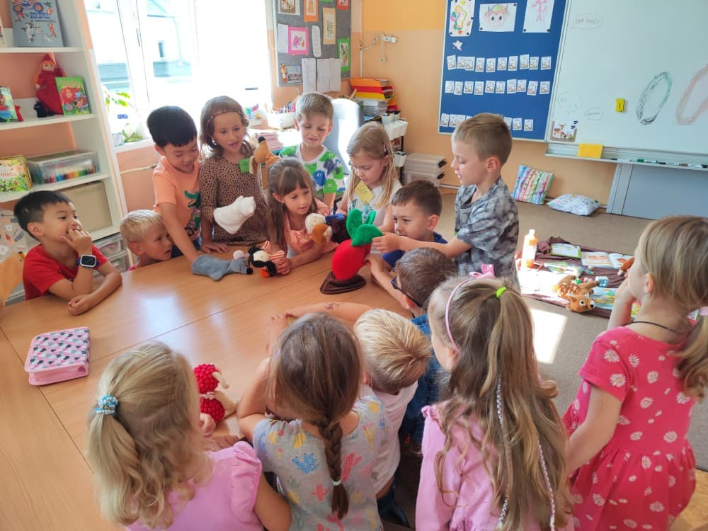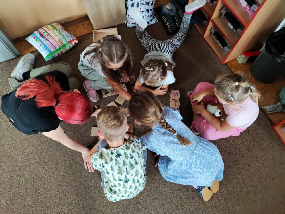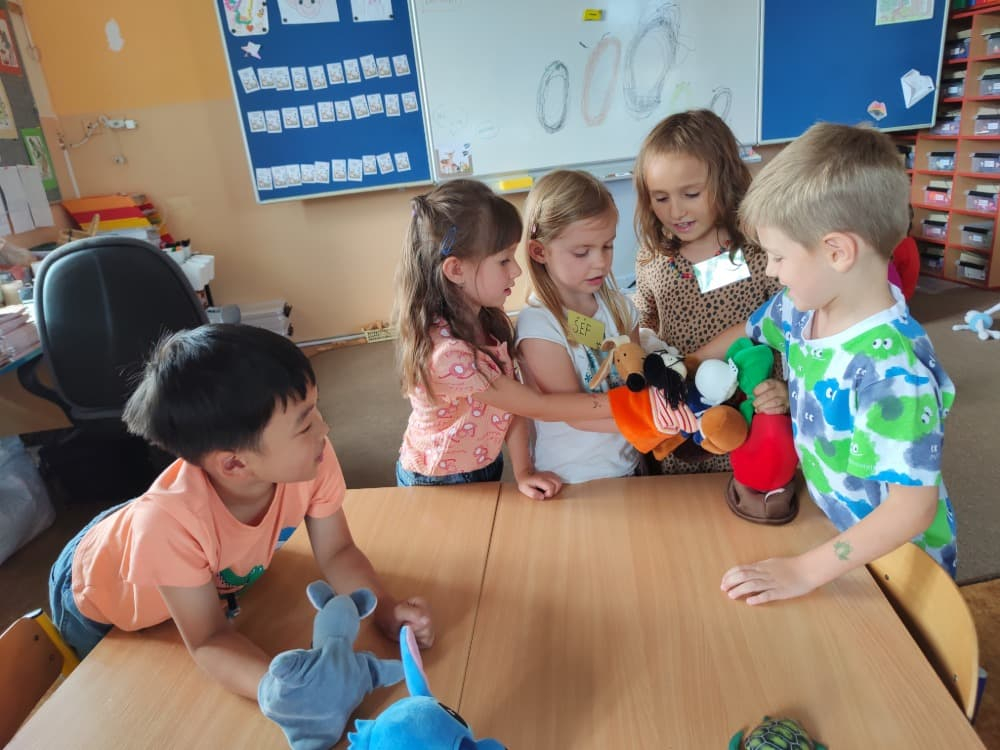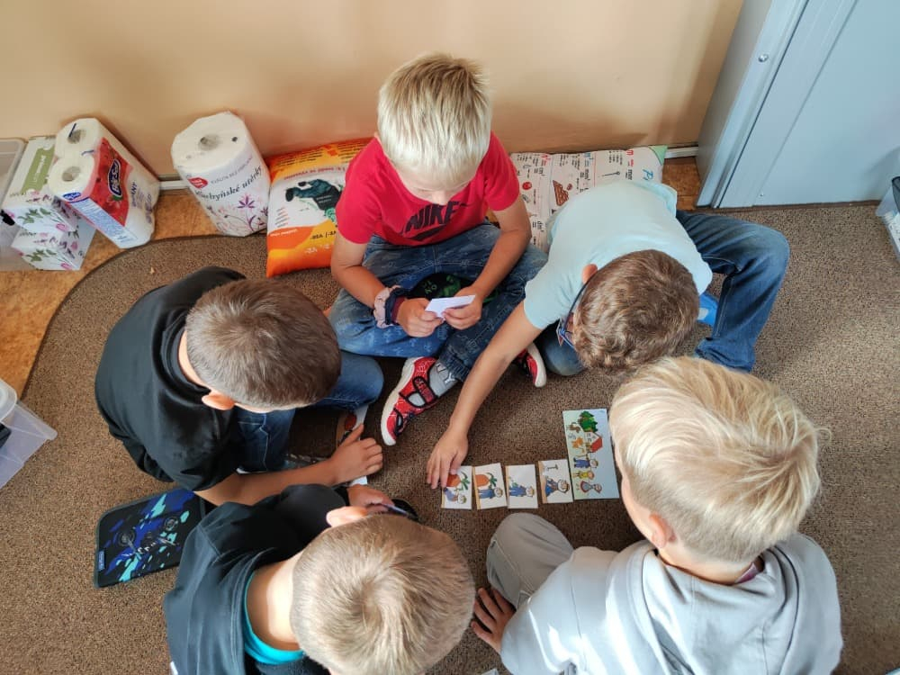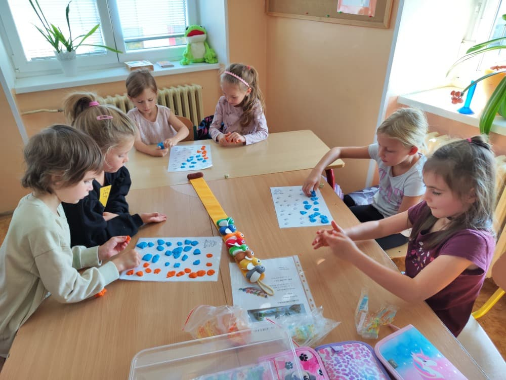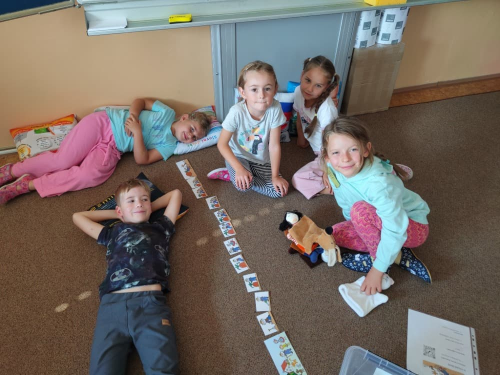 Hned druhý školní týden jsme se odvážně vrhli na práci v centrech aktivit. Práce nám šla hezky od ruky. Prvňáčci pilně pracovali a báječně spolupracovali. Někteří už ostatním i četli zadání. Čekalo je pečlivé vybarvování srnečky v ateliéru, lepení much na mucholapku u žabky Márinky v matematice a "chytání" much pro ni ke svačině. Poznávání a psaní písmenek J jako Jeníček a M jako Mařenka z perníkové chaloupky v centru psaní, poslouchání pohádky o veliké řepě, řazení obrázků a poté její dramatizace v centru čtení a poznávání lesních zvířecích rodin v centru vědy a objevů. Prvňáčci skvěle zvládli i své první hodnotící kruhy a své práce v nich krásně odprezentovali.