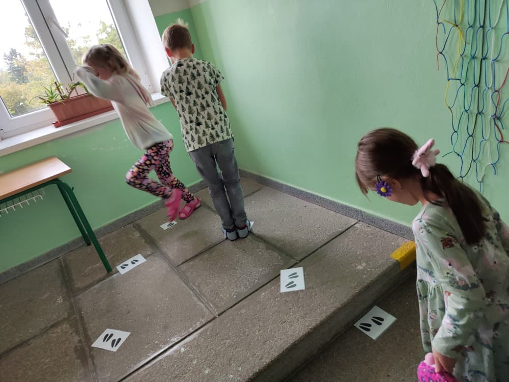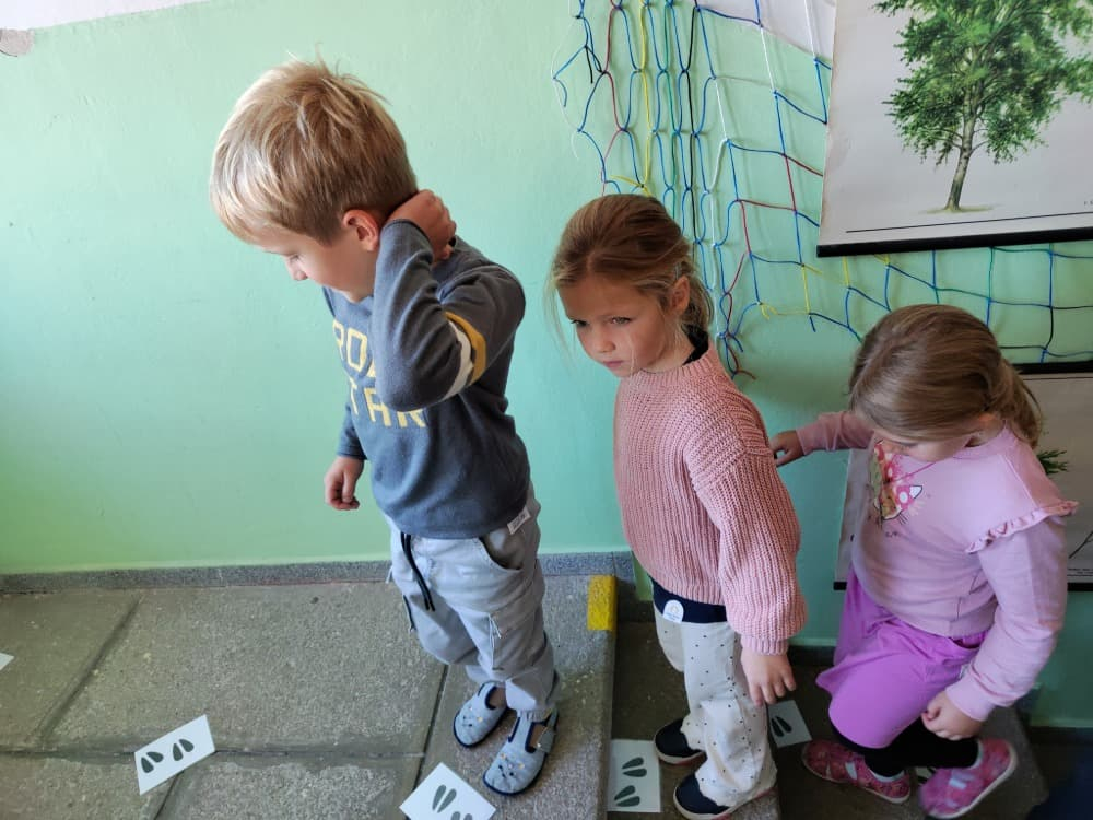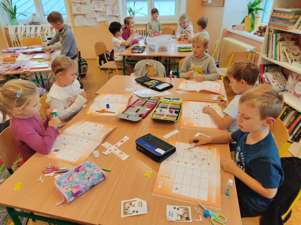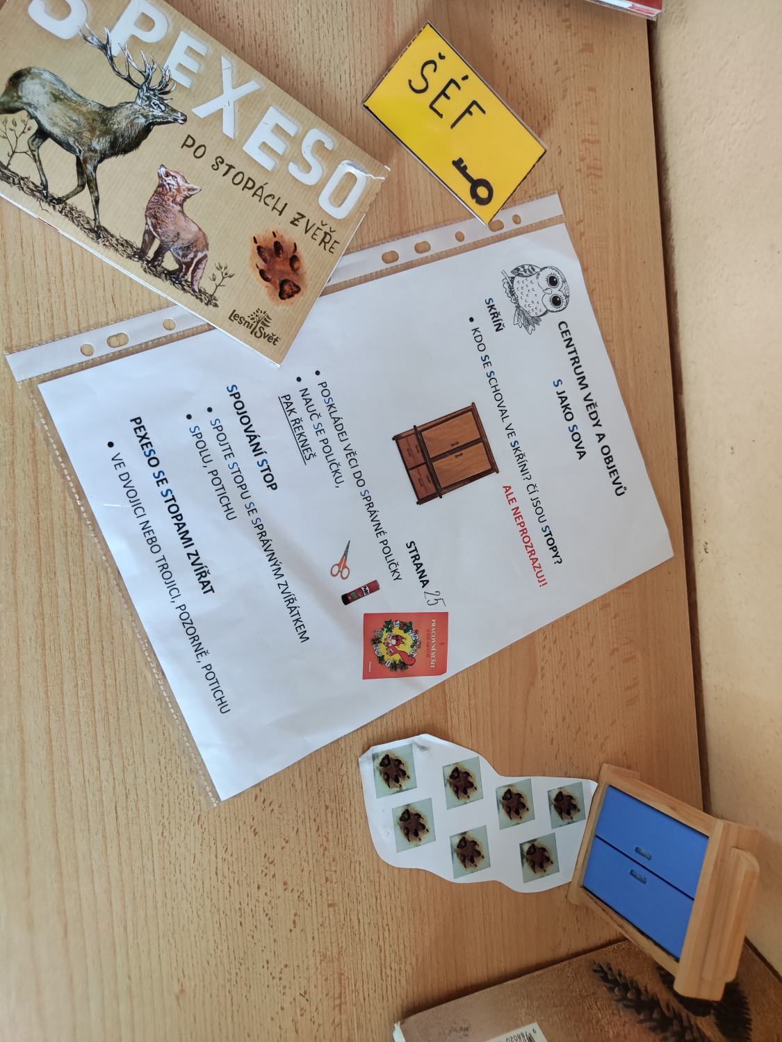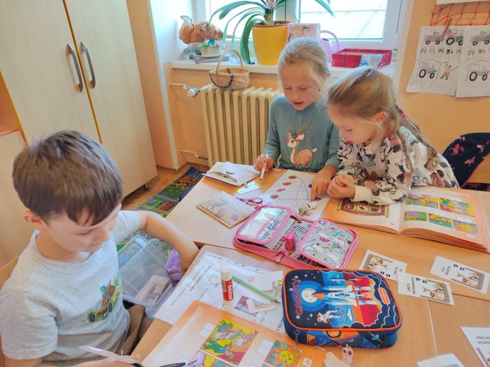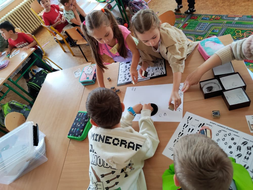 Třetí centra aktivit se celá točila kolem S. V ateliéru se tiskaly stopy zvířat, vzniklo první společné dílo a spousta malých obrázků, v centru vědy a objevů se pátralo, čí stopy vedou do skříně a do sešitové skříně se skládala spousta věcí. V matematice se stopovala srnka, stoupalo se do stop správným směrem, schovávala se zvířátka a skládalo se z papíru. V centru psaní se stříhalo, sypala slunečnicová semínka (přesunovala ve špetičce ze tří prstů na trénování správného úchopu), s citem se obtahovala vystouplá čísla a písmena, vybarvoval se strom podle tvarů písmenka s a skládalo se rozstříhané s. V centru čtení se poslouchala pohádka o Smolíčkovi, skládaly se obrázky a stříhaly a srovnávaly se symboly podle zadání. Práce dětí byla super!