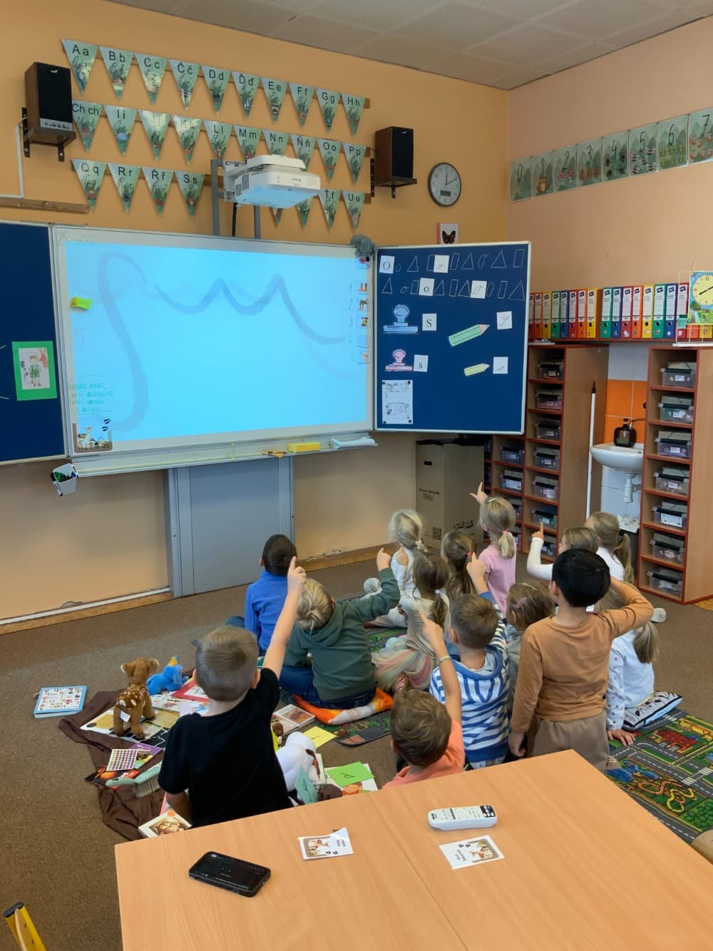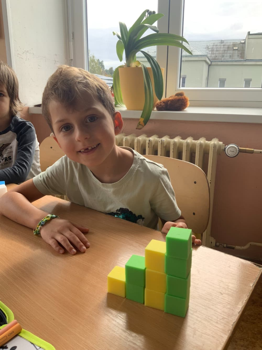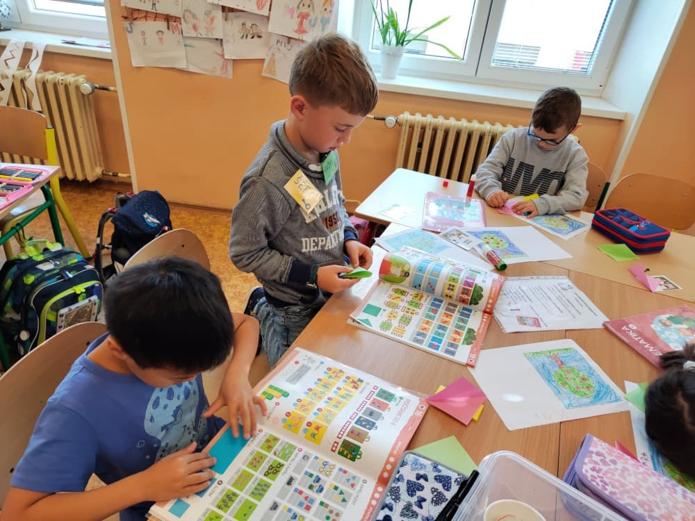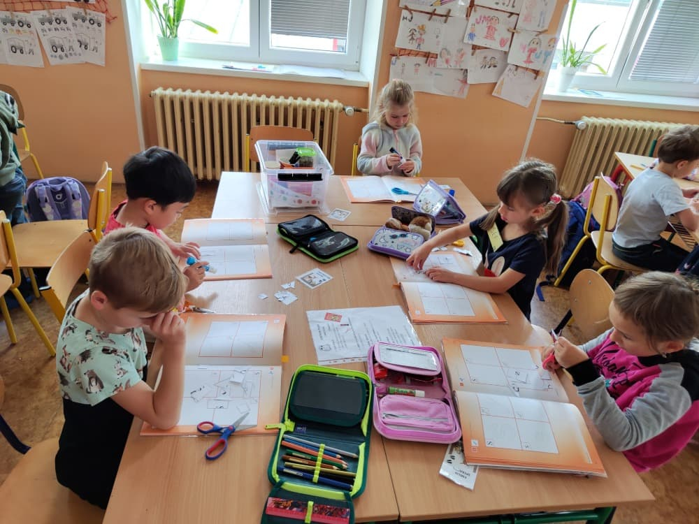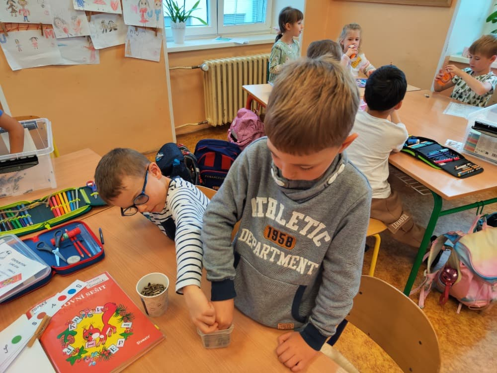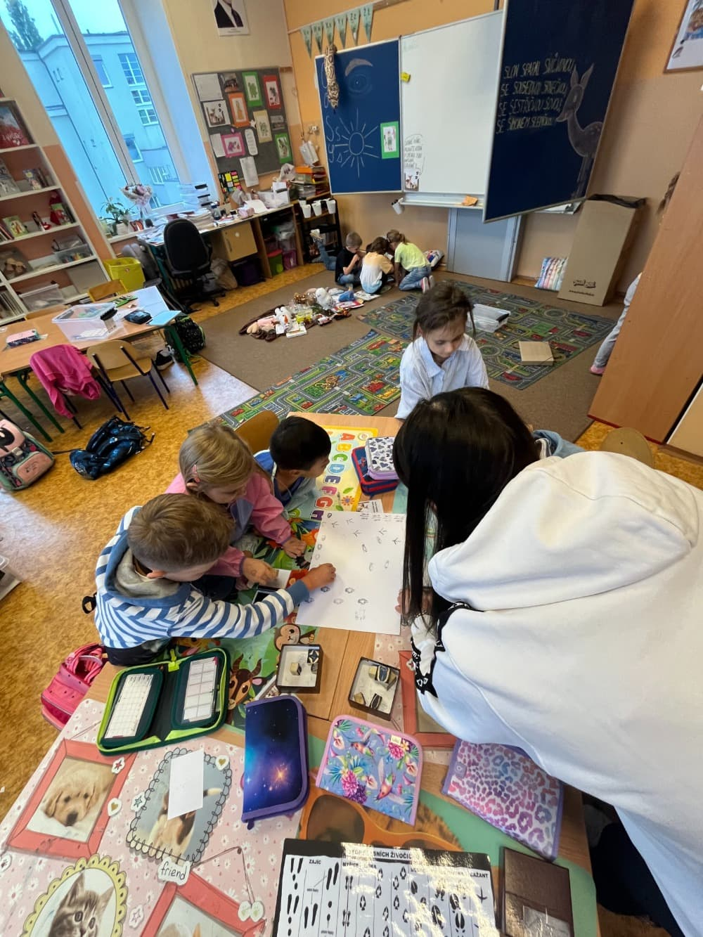 Třetí centra aktivit se celá točila kolem S. V ateliéru se tiskaly stopy zvířat, vzniklo první společné dílo a spousta malých obrázků, v centru vědy a objevů se pátralo, čí stopy vedou do skříně a do sešitové skříně se skládala spousta věcí. V matematice se stopovala srnka, stoupalo se do stop správným směrem, schovávala se zvířátka a skládalo se z papíru. V centru psaní se stříhalo, sypala slunečnicová semínka (přesunovala ve špetičce ze tří prstů na trénování správného úchopu), s citem se obtahovala vystouplá čísla a písmena, vybarvoval se strom podle tvarů písmenka s a skládalo se rozstříhané s. V centru čtení se poslouchala pohádka o Smolíčkovi, skládaly se obrázky a stříhaly a srovnávaly se symboly podle zadání. Práce dětí byla super!