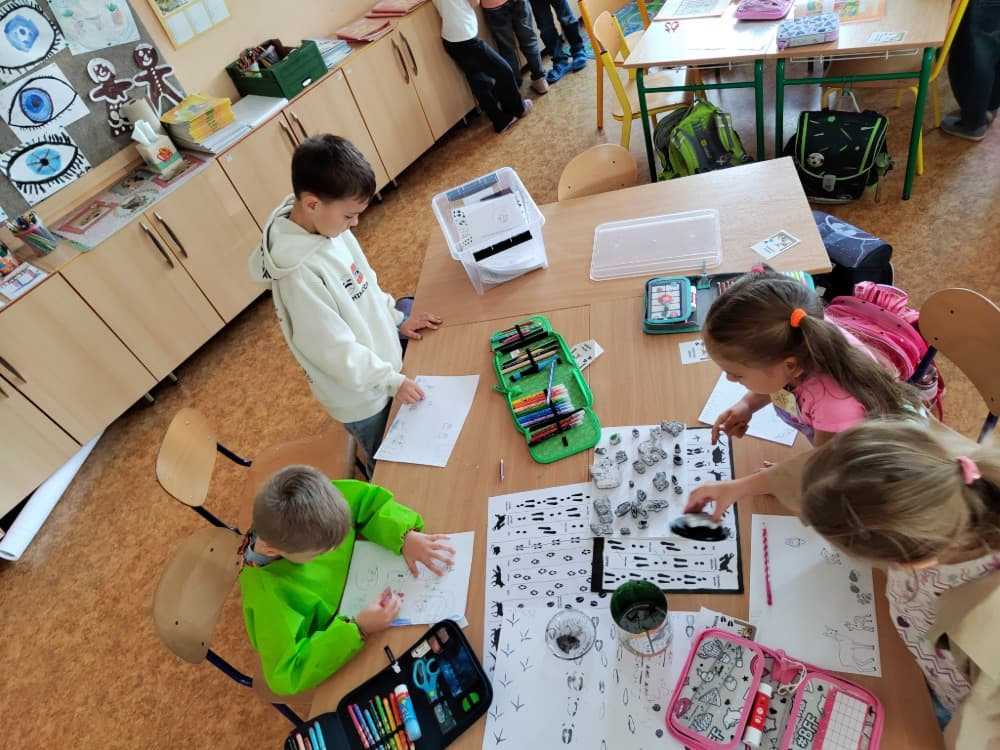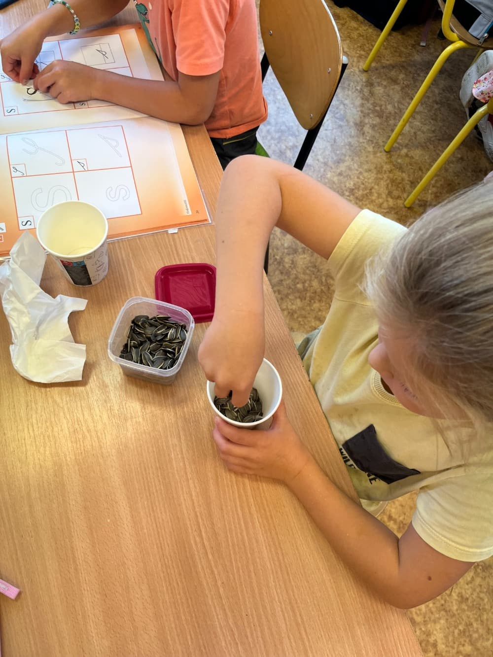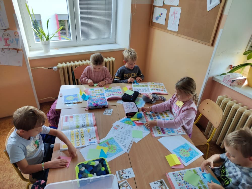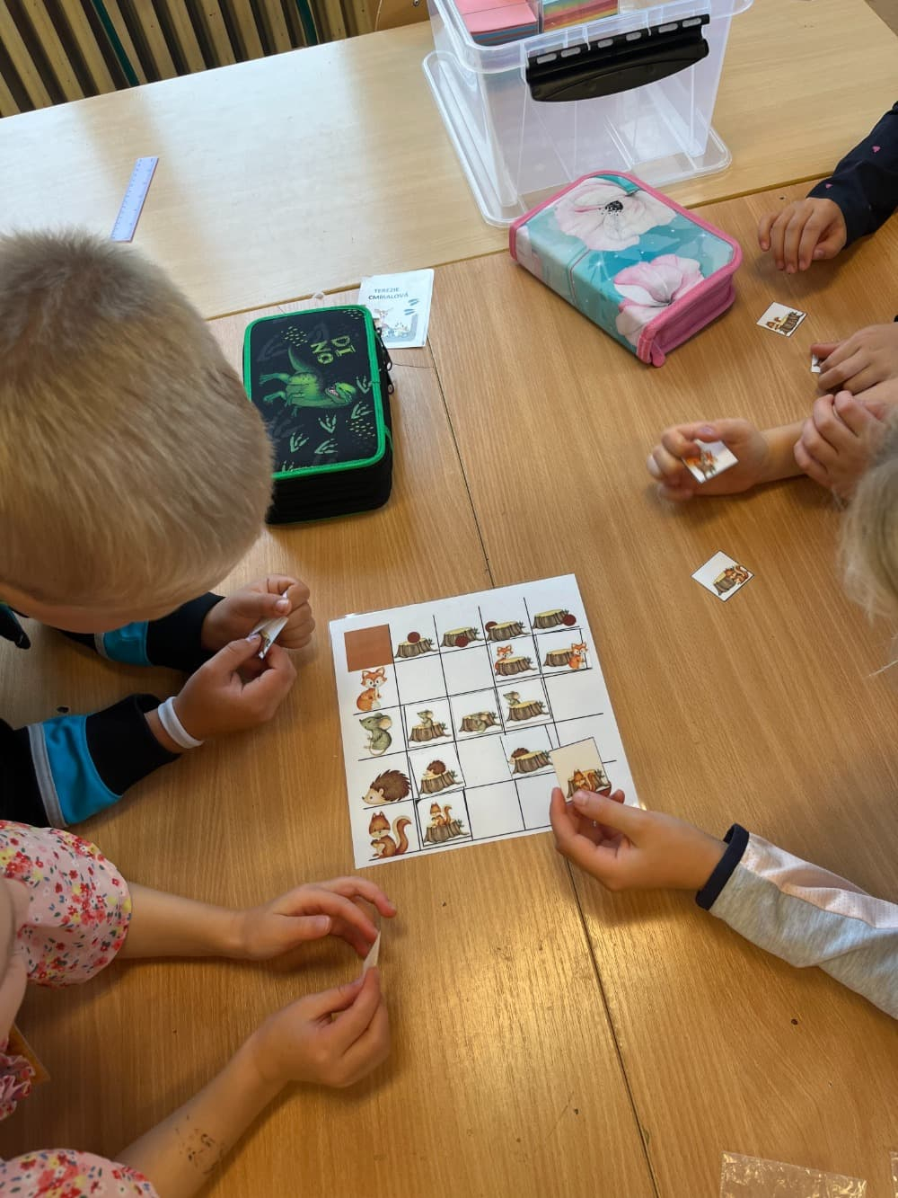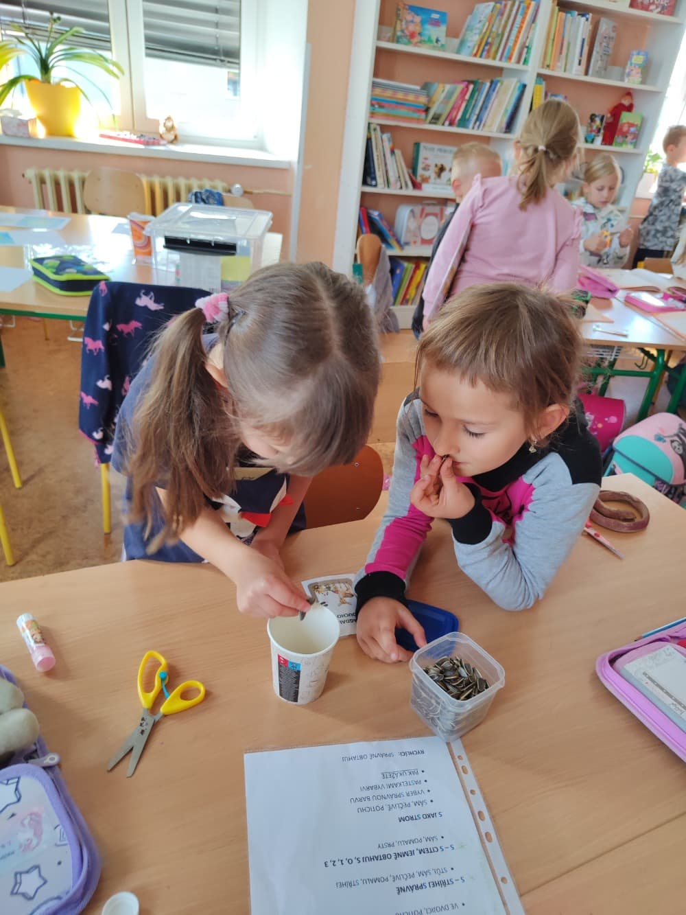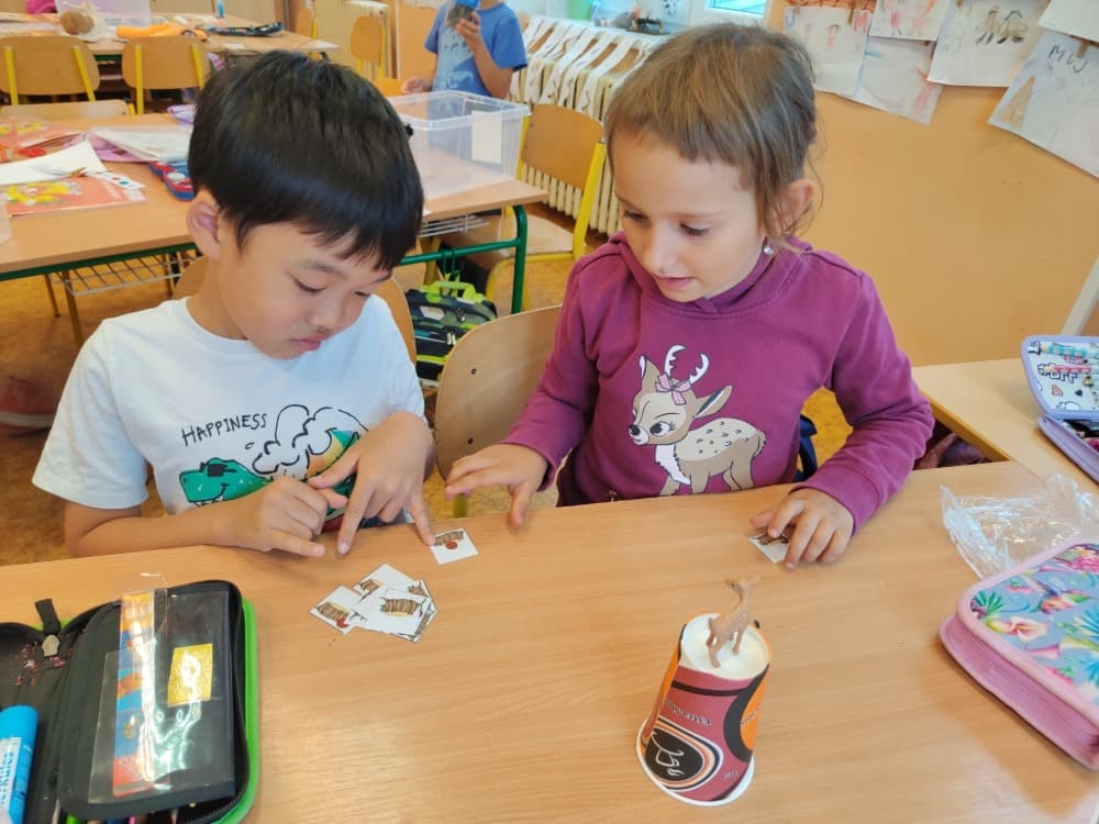 Třetí centra aktivit se celá točila kolem S. V ateliéru se tiskaly stopy zvířat, vzniklo první společné dílo a spousta malých obrázků, v centru vědy a objevů se pátralo, čí stopy vedou do skříně a do sešitové skříně se skládala spousta věcí. V matematice se stopovala srnka, stoupalo se do stop správným směrem, schovávala se zvířátka a skládalo se z papíru. V centru psaní se stříhalo, sypala slunečnicová semínka (přesunovala ve špetičce ze tří prstů na trénování správného úchopu), s citem se obtahovala vystouplá čísla a písmena, vybarvoval se strom podle tvarů písmenka s a skládalo se rozstříhané s. V centru čtení se poslouchala pohádka o Smolíčkovi, skládaly se obrázky a stříhaly a srovnávaly se symboly podle zadání. Práce dětí byla super!