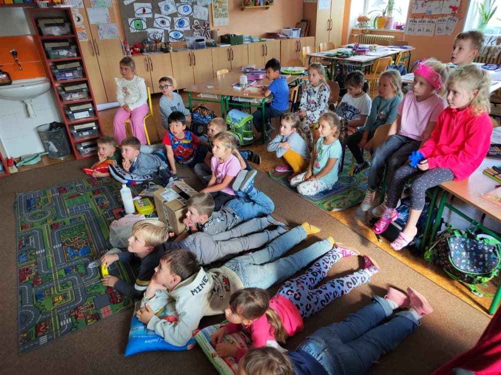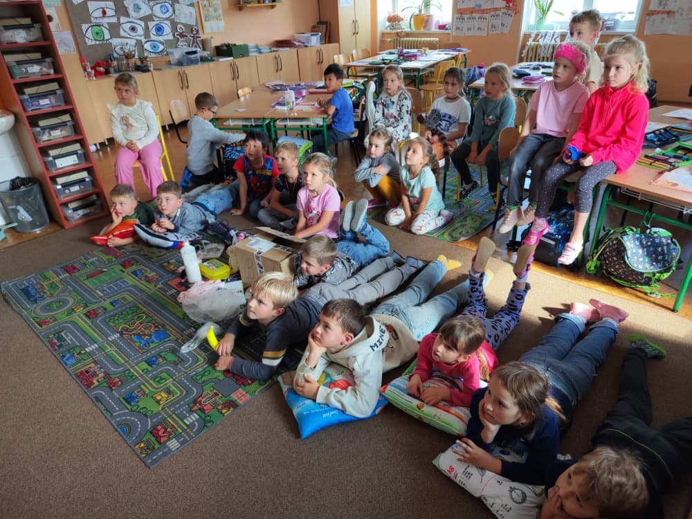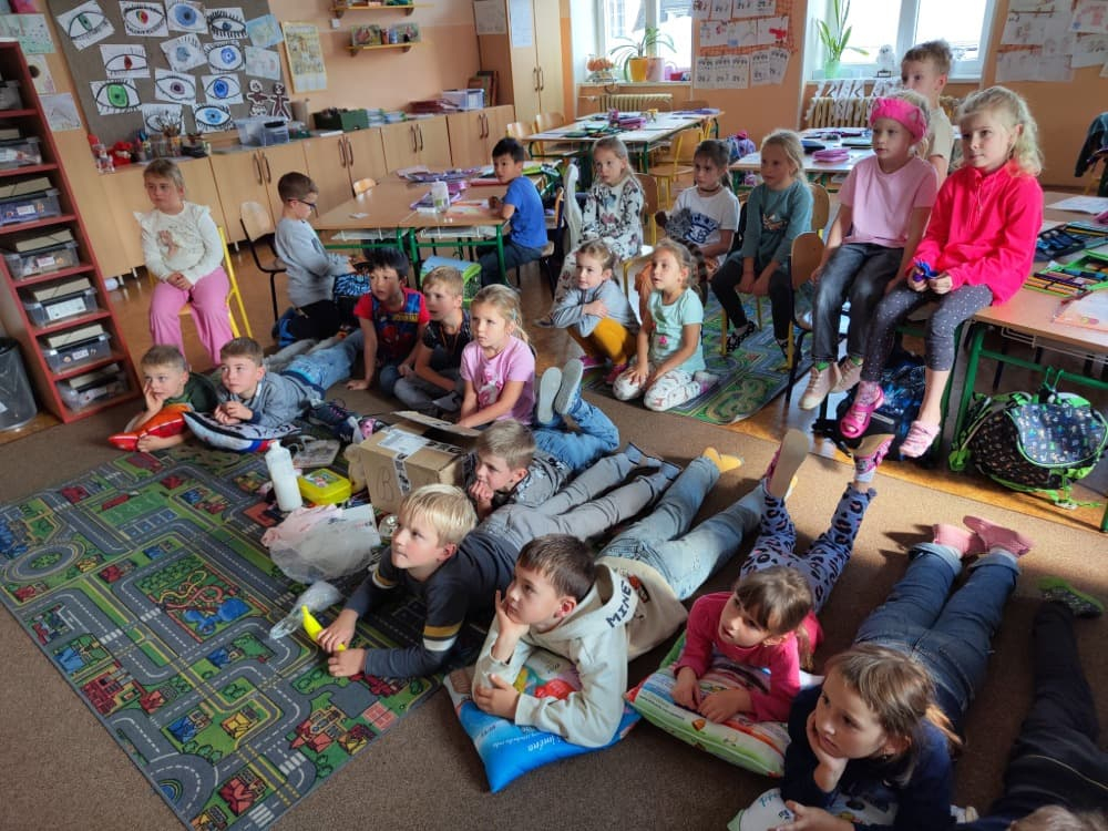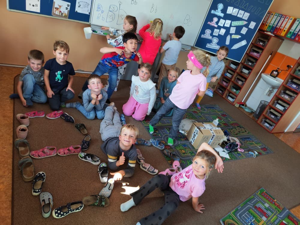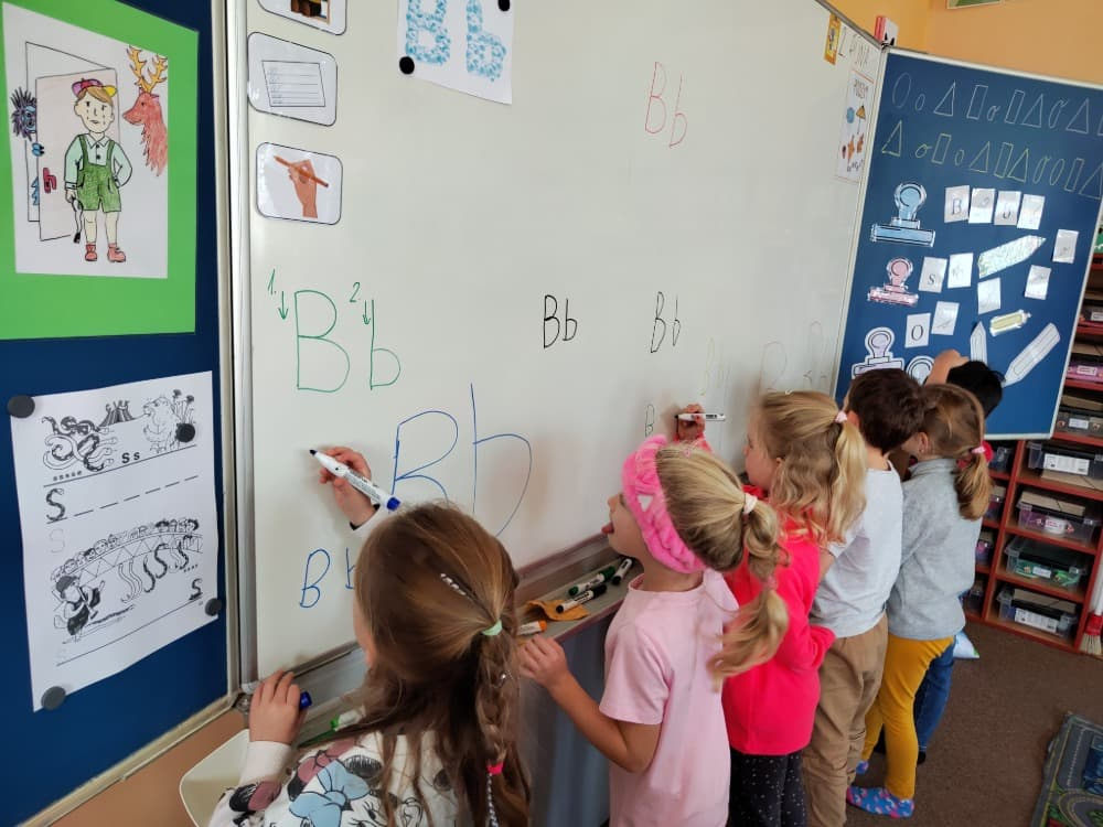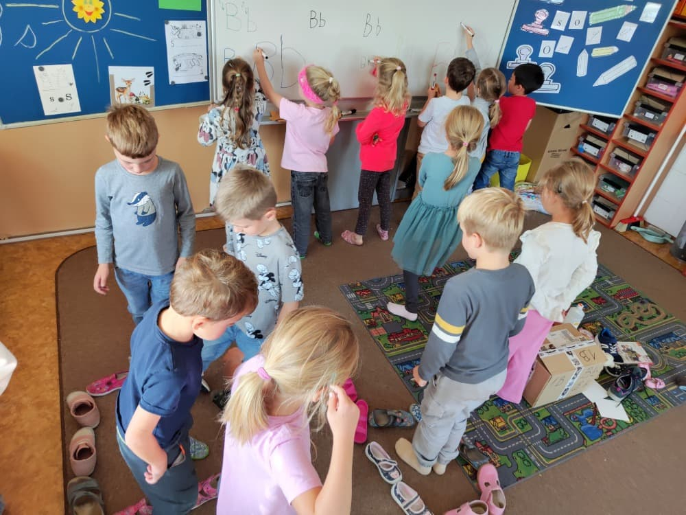 Dny s písmenkem B byly bezva. Nejprve nám do třídy přišel balík plný pokladů začínajících na b, další den jsme se vypravili za bublinami, které nás dovedly až do botanické zahrady. Tam bylo báječně a bylo tam hodně B. Hledali jsme je a počítali. Našli jsme také bonsaje, banánovník, bambus, kakaové boby, pavilon B i ryby bodloky. Zpět jsme se vrátili tajnou brankou. Ochutnali jsme sušené banány a poslouchali pohádku O Budulínkovi. Bubnovali jsme, zpívali písničku "Tluče bubeníček" a uvolňovali ruku kreslením balónků a vybarvováním technikou "přitlač, povol". Další dny byly sladké, přímo bonbónové...