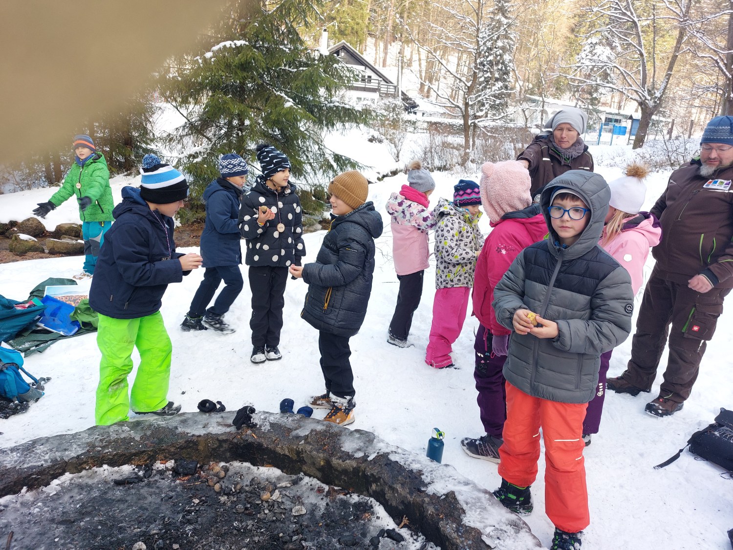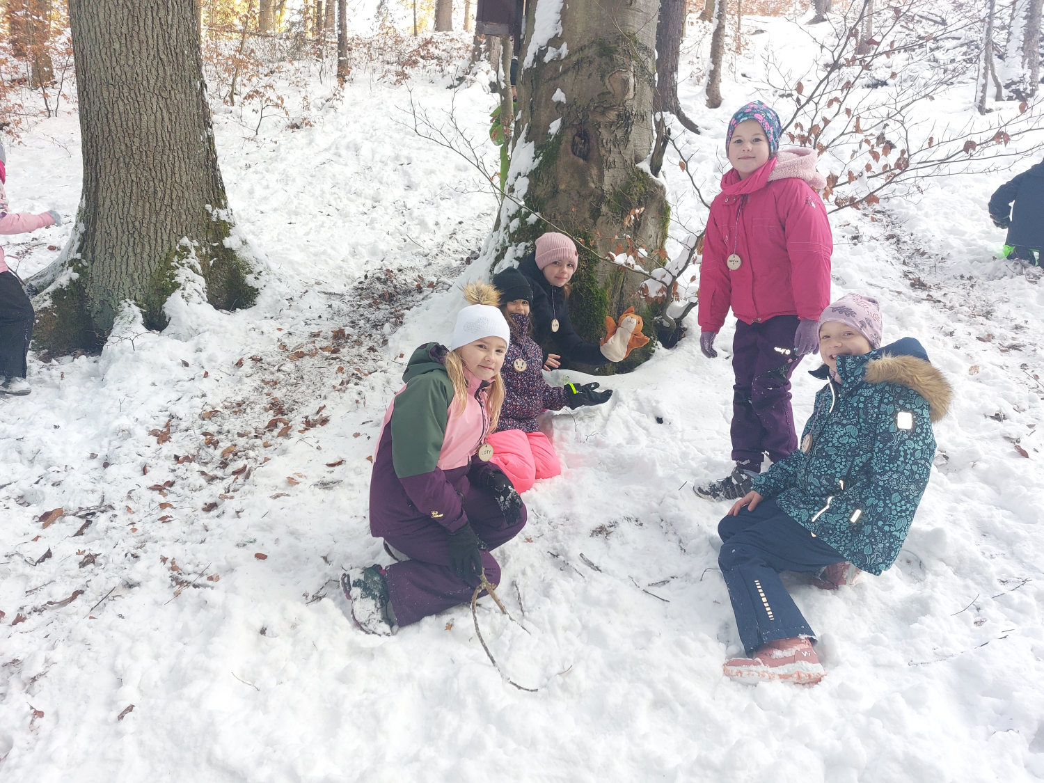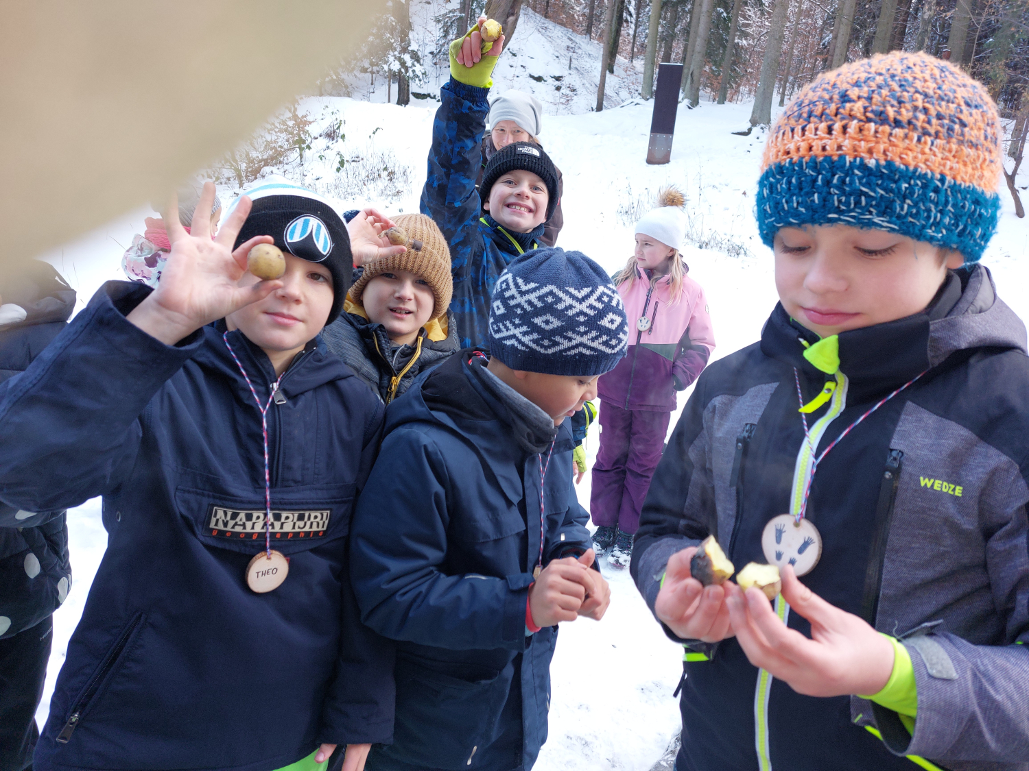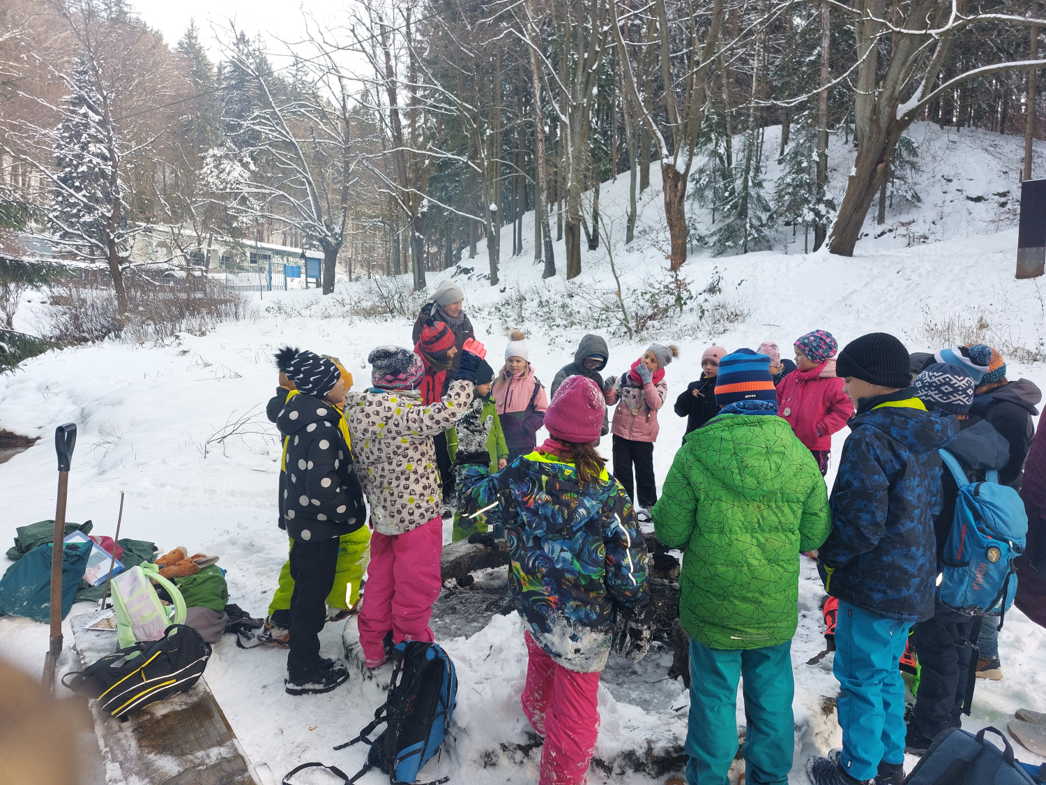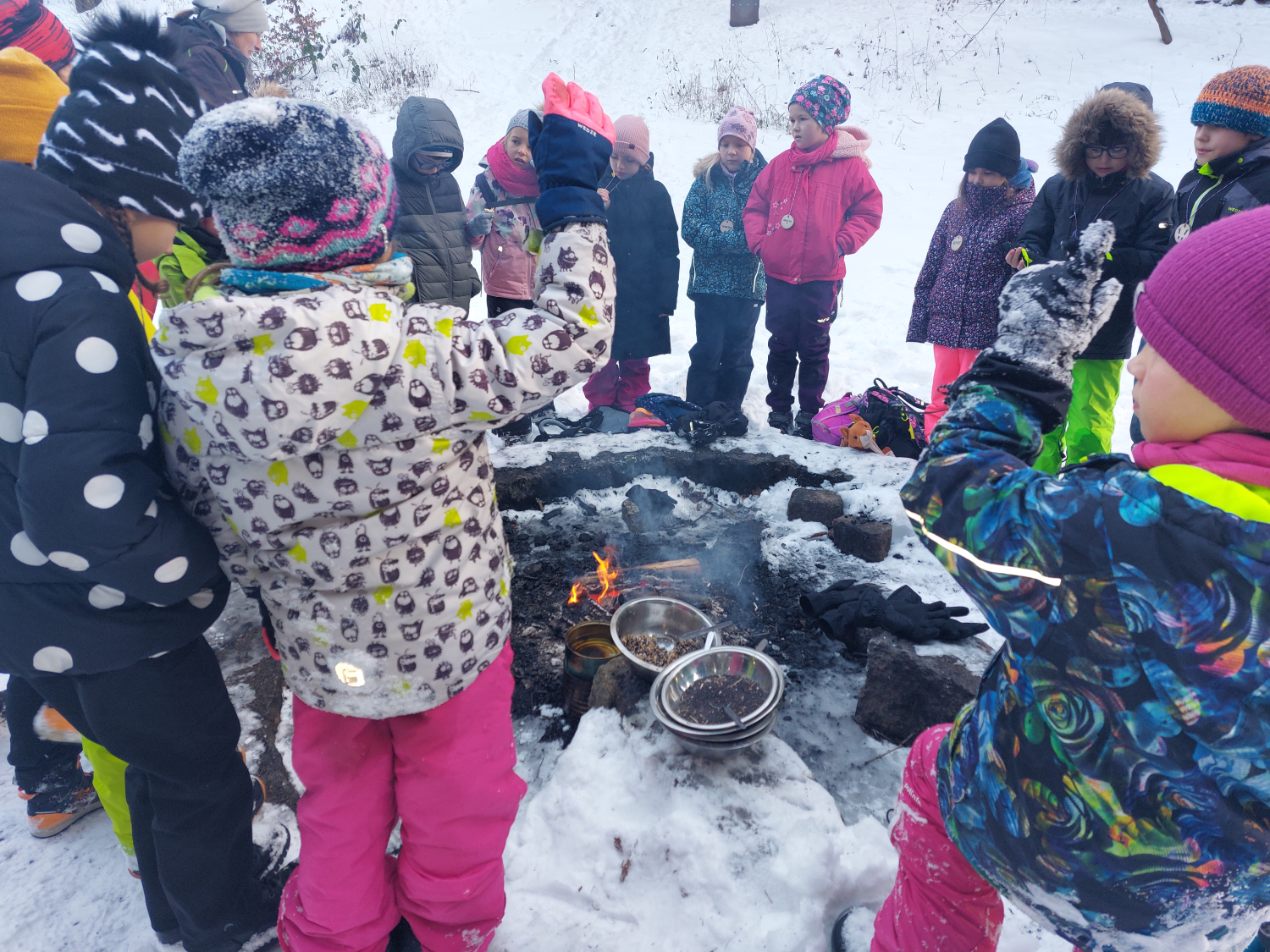 Opět jsme se vydali na naše místo za veverkou Šmejdilkou. Stali jsme se pozorovateli zvířat, rostlin a badateli jako lidé. Měřili jsme opět teplotu vody, vzduchu a půdy. Je to velmi pozoruhodné a děti už o změnách krásně diskutují. Ohřáli jsme se u ohniště a pochutnali jsme si na pečených bramborech v popelu. Mňam.