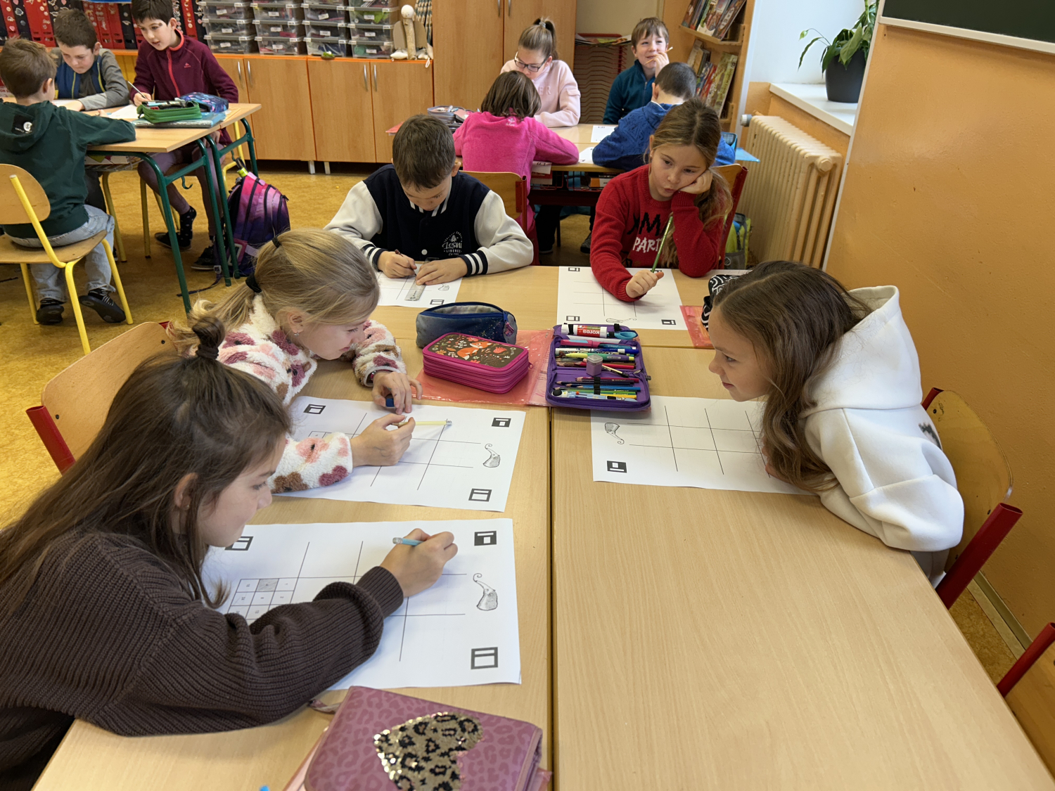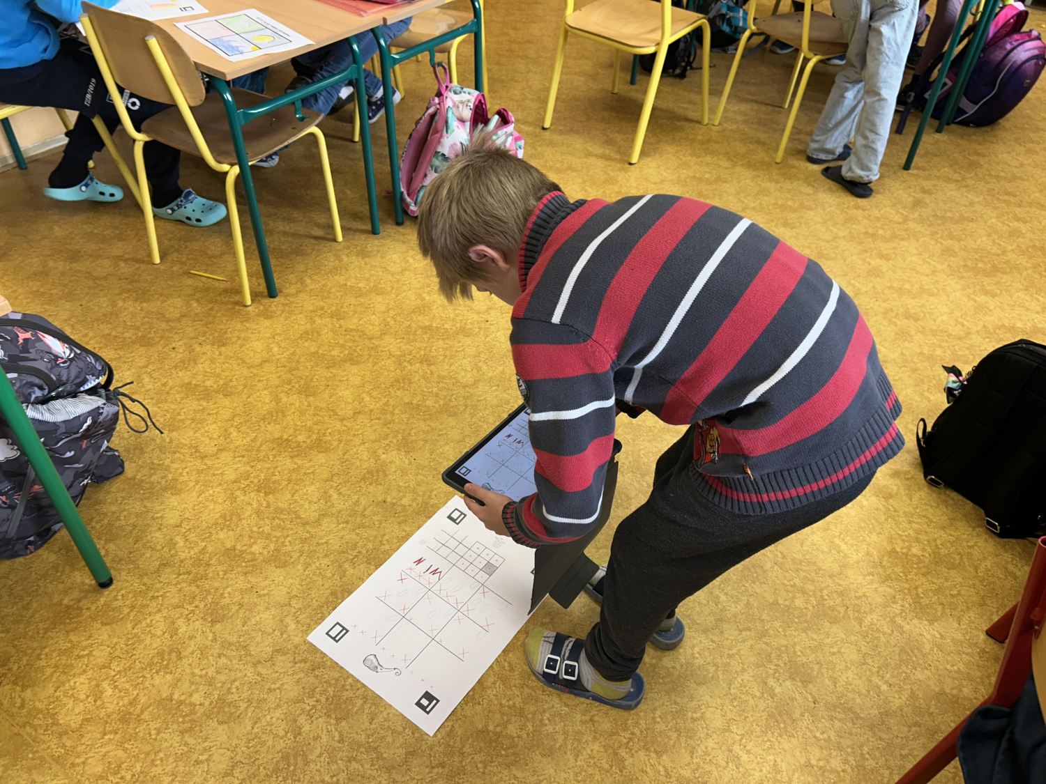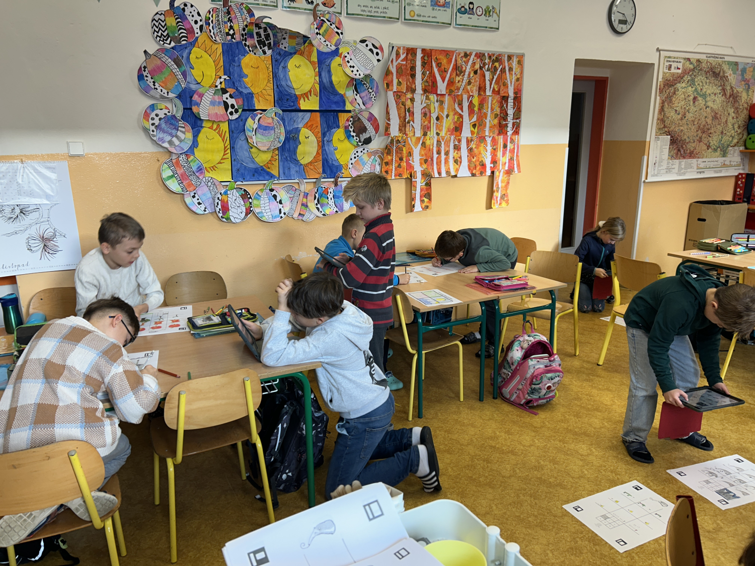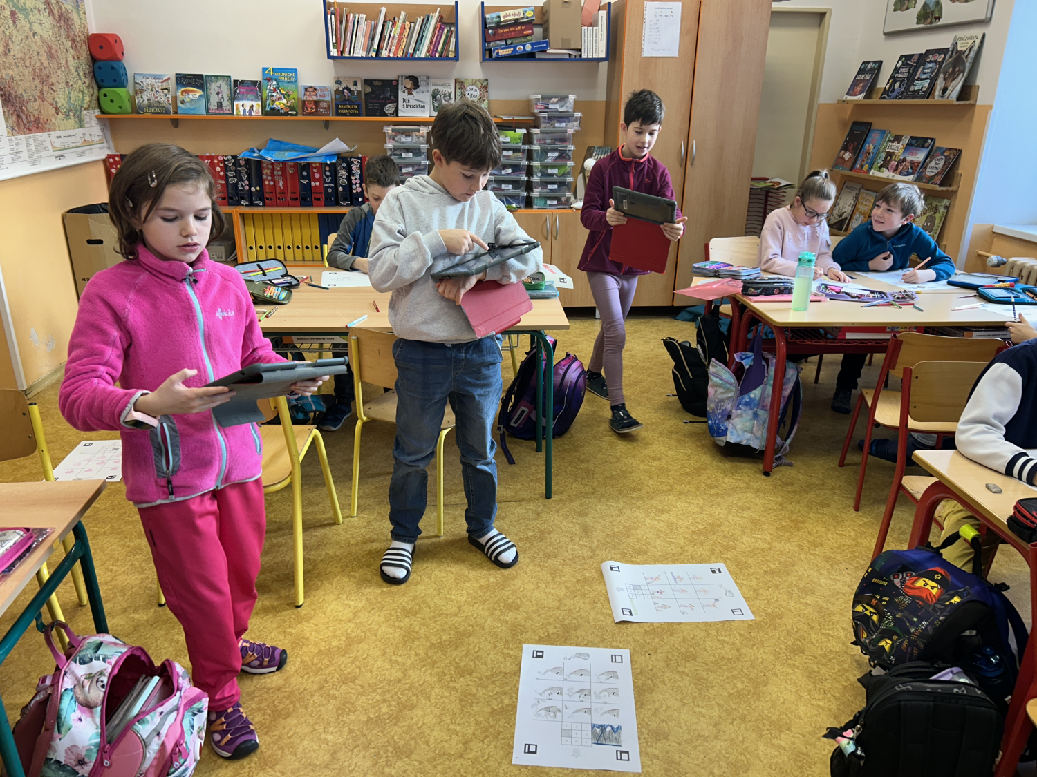 Tentokrát jsme se s dětmi seznámili s možnostmi digitální tvorby a animace. Nejprve děti namalovaly devět různých obrázků, které následně pomocí tabletů proměnily v jednoduchý pohyblivý obrázek – gif. Prostřednictvím naskenování QR kódu s odkazem na webovou stránku své obrázky nahrály a „rozpohybovaly“. Zároveň si prakticky vyzkoušely práci se školním e-mailem: přihlášení do účtu a odeslání hotového obrázku mamince.