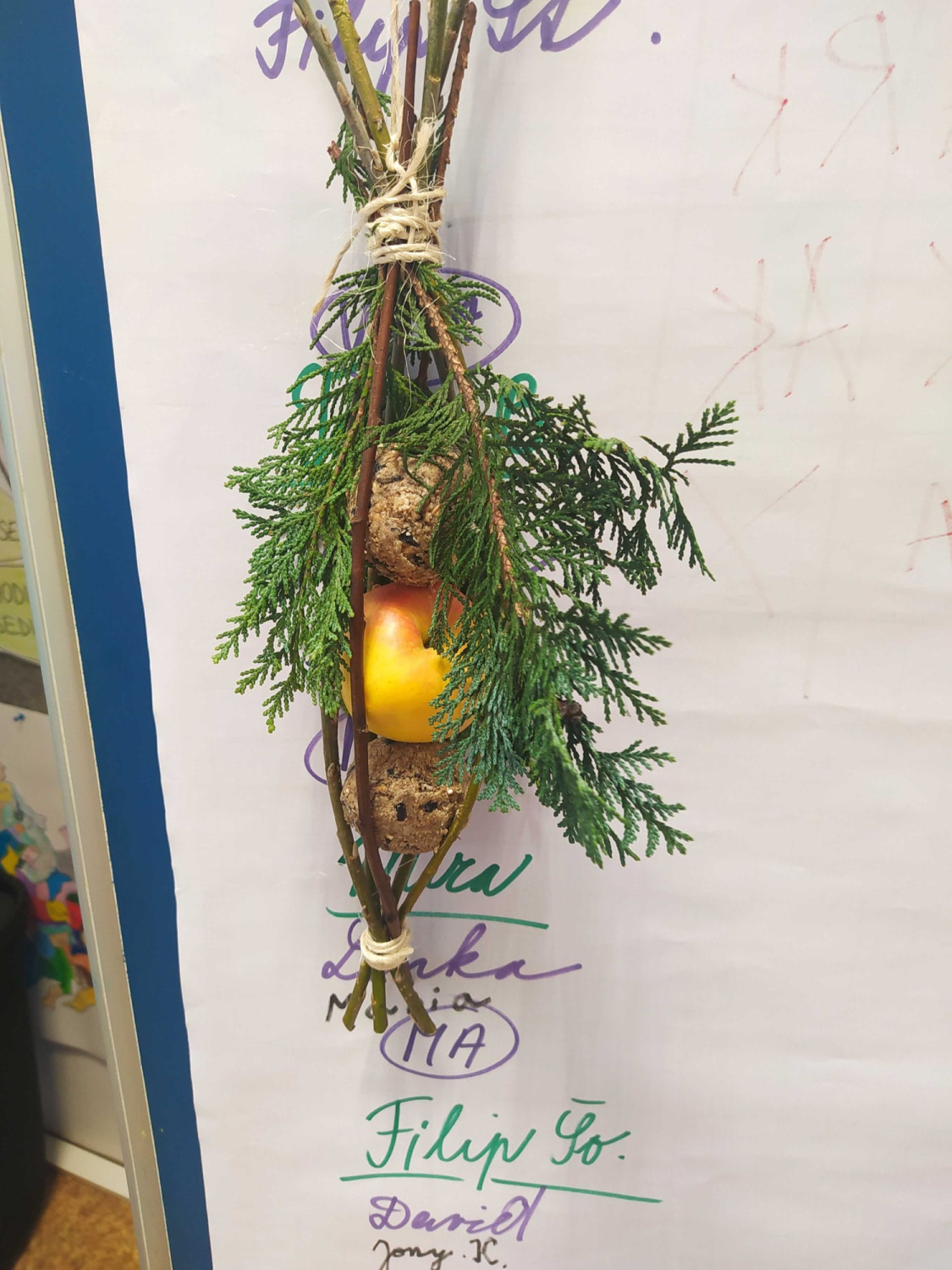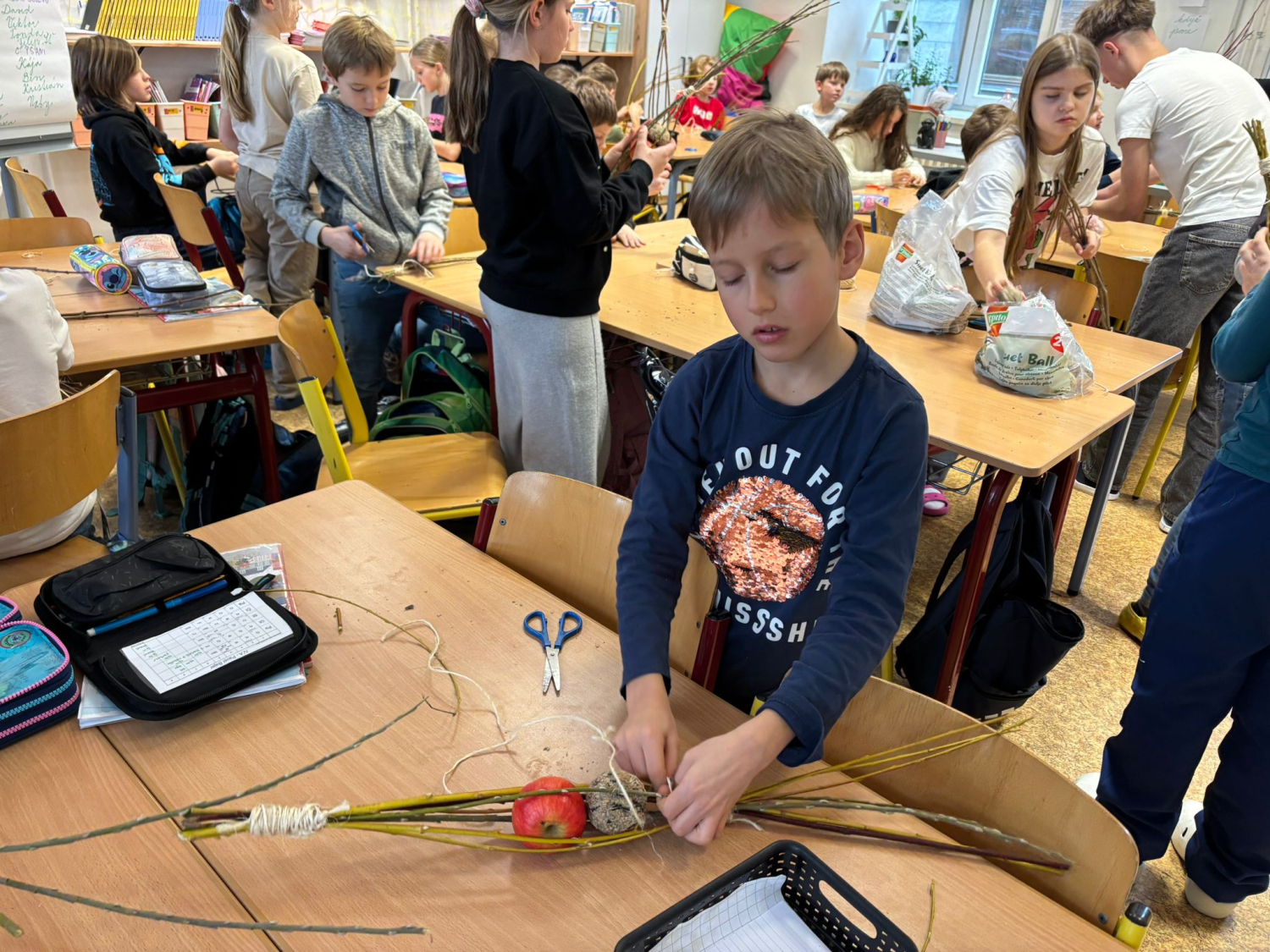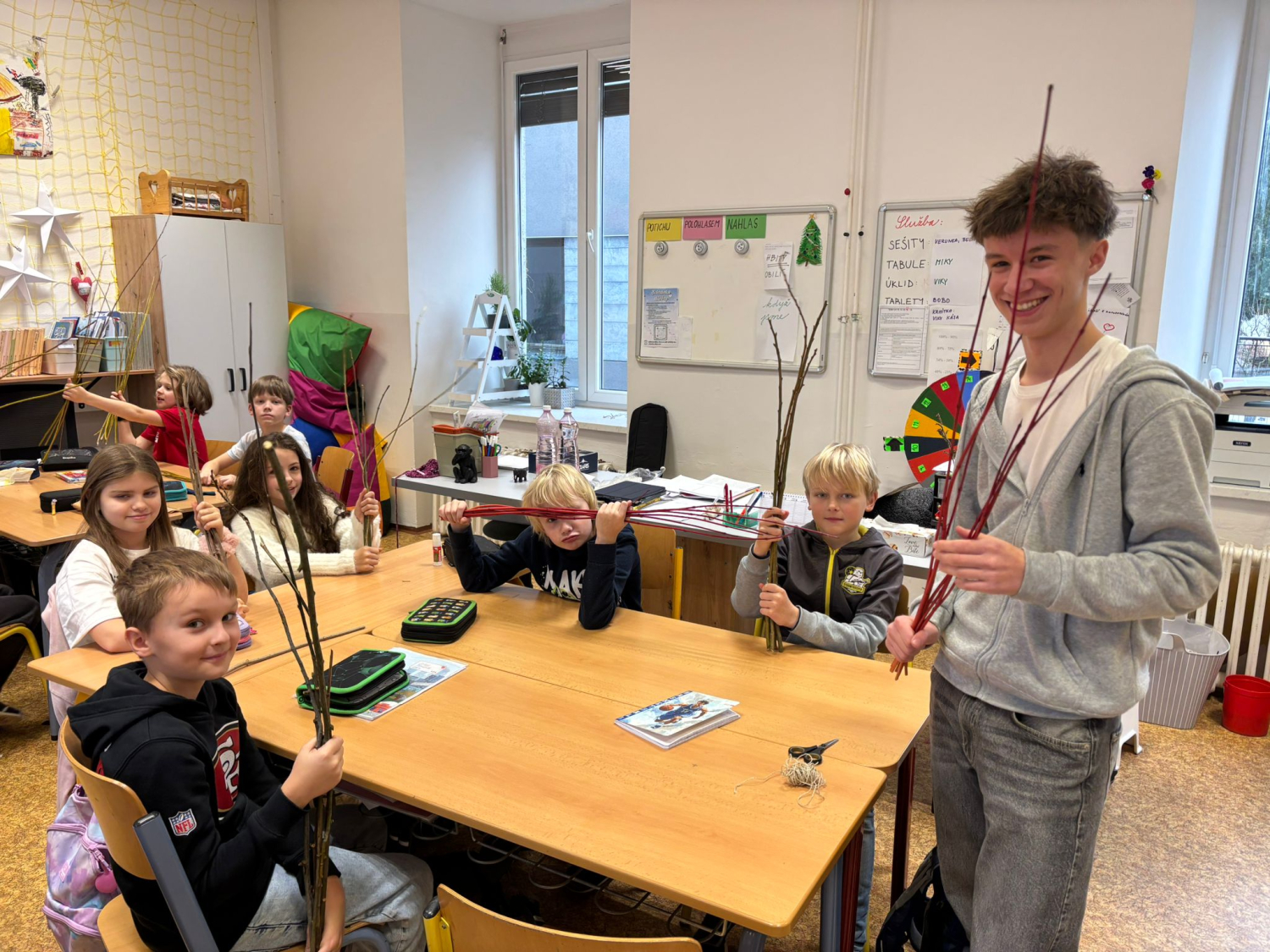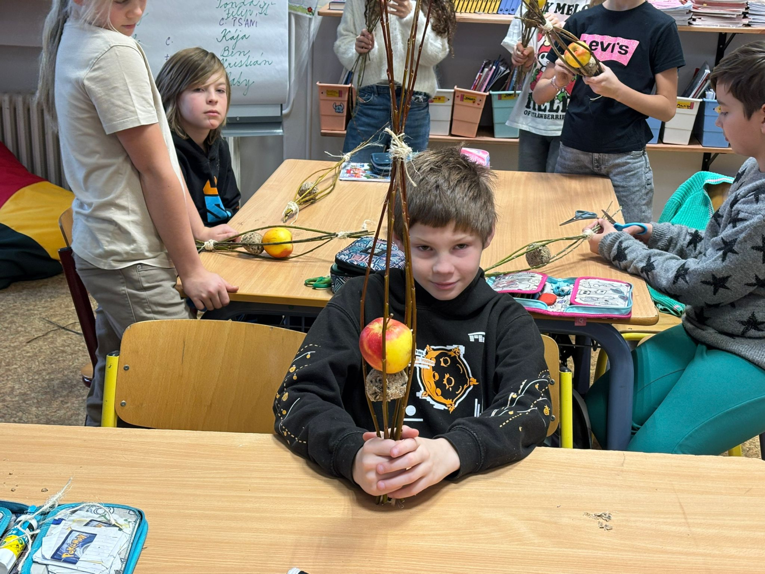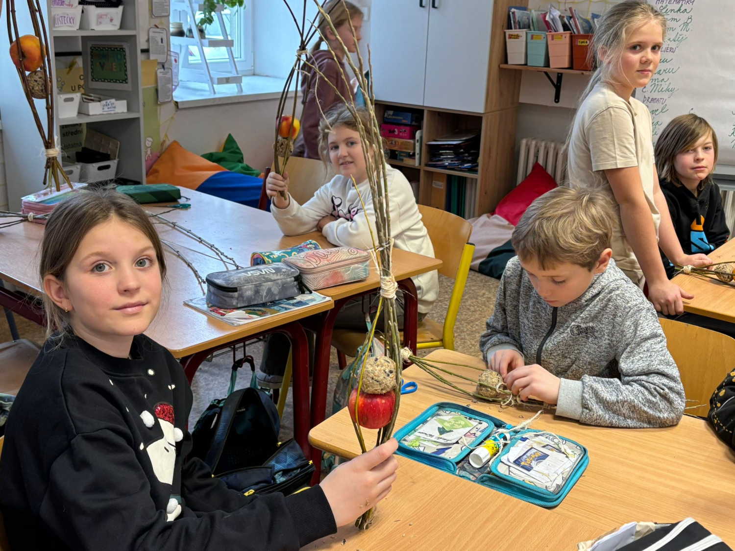 Kuba s 9. A vymyslel v rámci své ročníkové práce jednoduché krmítko pro ptáky. Do třídy přišel a každý si podle jeho návrhu krmítko vyrobil. Fungovalo. Děti pracovaly s přírodním materiálem, který si samy obstaraly.